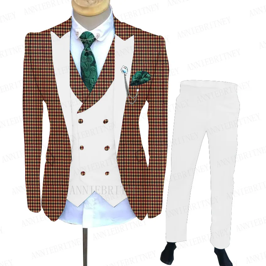 Новинка 2021, дизайнерский клетчатый костюм цвета Бургунди для мужчин с белыми брюками-жилетом, индивидуальный приталенный Блейзер, свадебное платье для жениха, смокинг