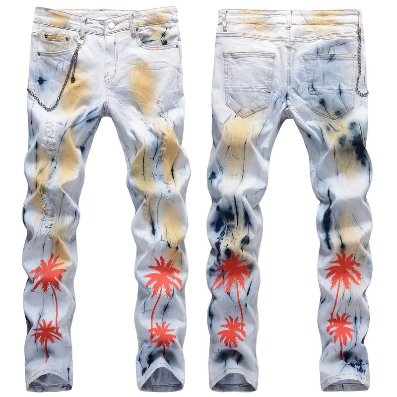Кокосовые пальмы напечатанные подвесная цепь, уникальное украшение Рваные джинсы Для мужчин оригинальный дизайн бренда узкие Стрейчевые мужские джинсы