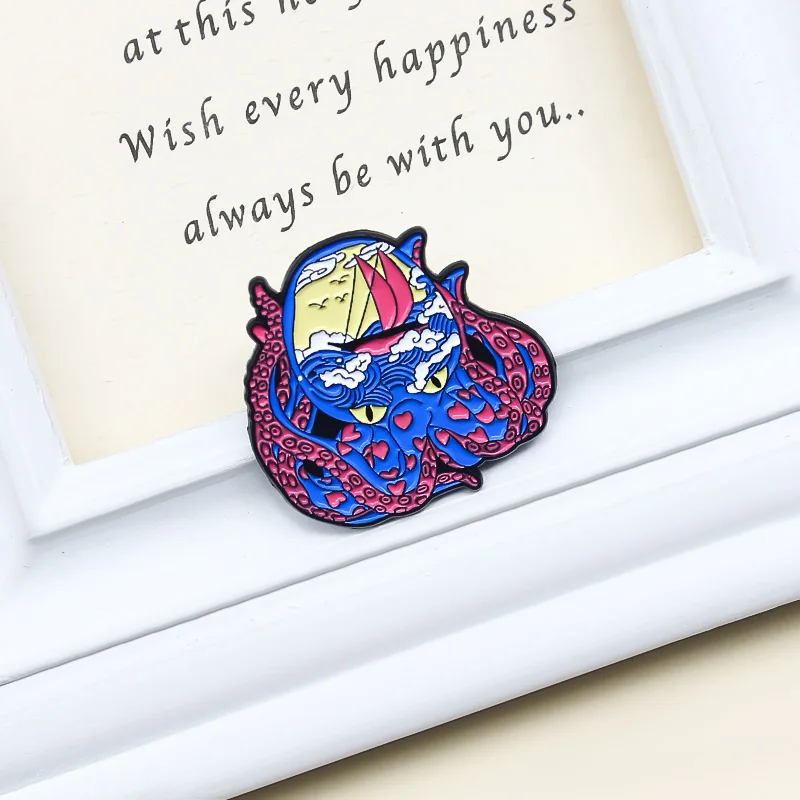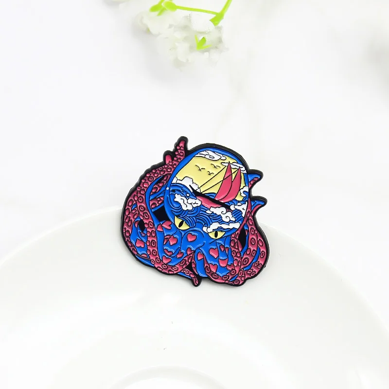 Брошь на лацкан с изображением синего осьминога, волны, облака, парусника
