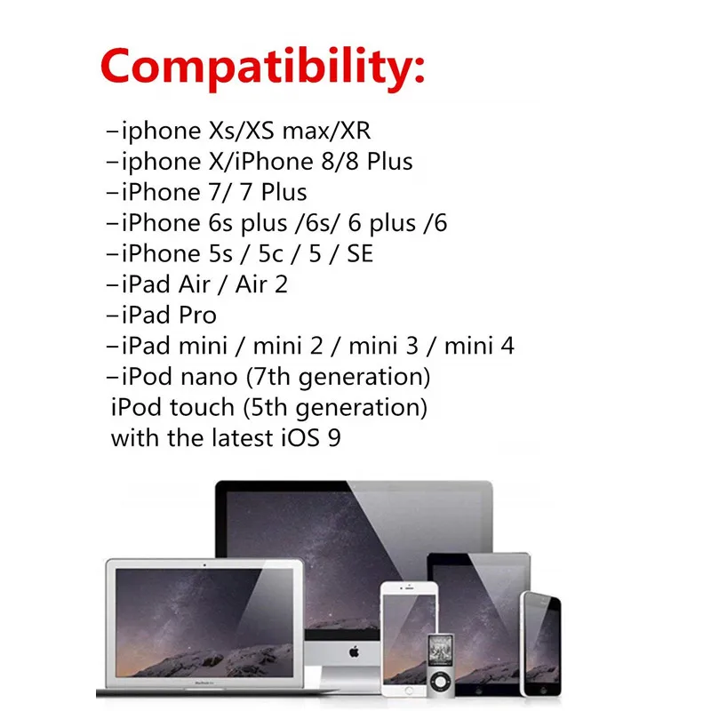 Высокая скорость зарядки и синхронизации Совместимость с iPhone 11 / 11Pro / 11Max / X / XS Max / XR / 8 / 8 Plus / 7 / 7 Plus / 6s / 6s Plus / 6 / 6 Plus / SE / 5S / 5C / 5, iPad Pro, iPad (6th / 5th / 4th / 3th / 2th поколения), для iPad, iPad mini 4 / 3 / 2, для iPad mini, iPad Air 2, iPad Air, iPod Touch (6-е/5-е поколение)