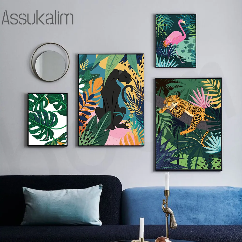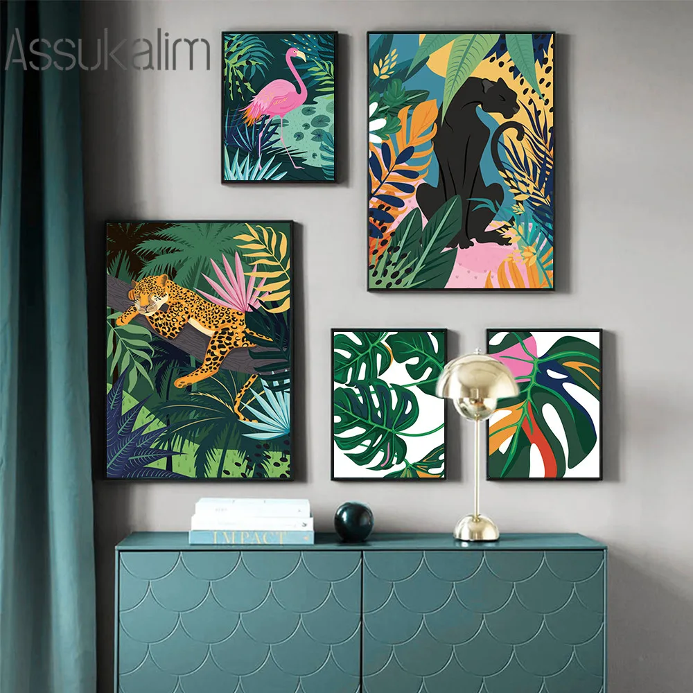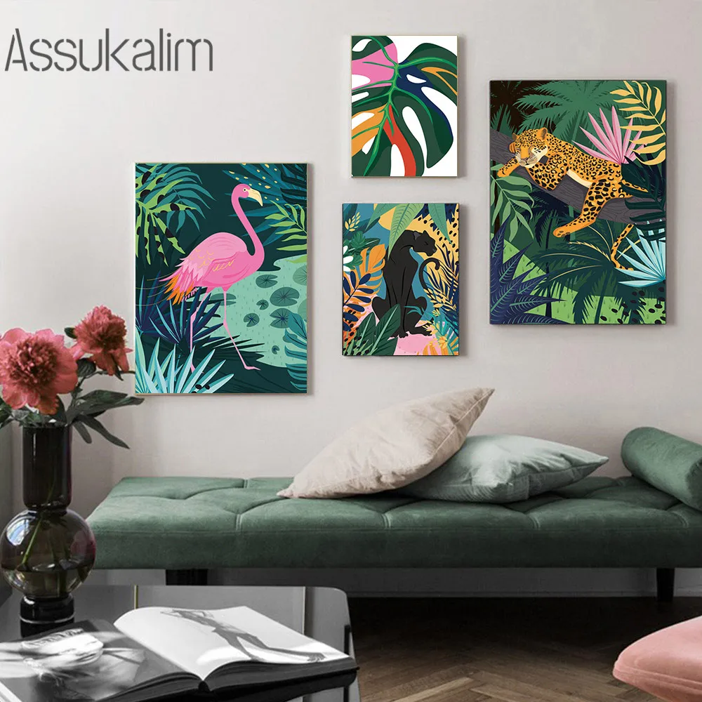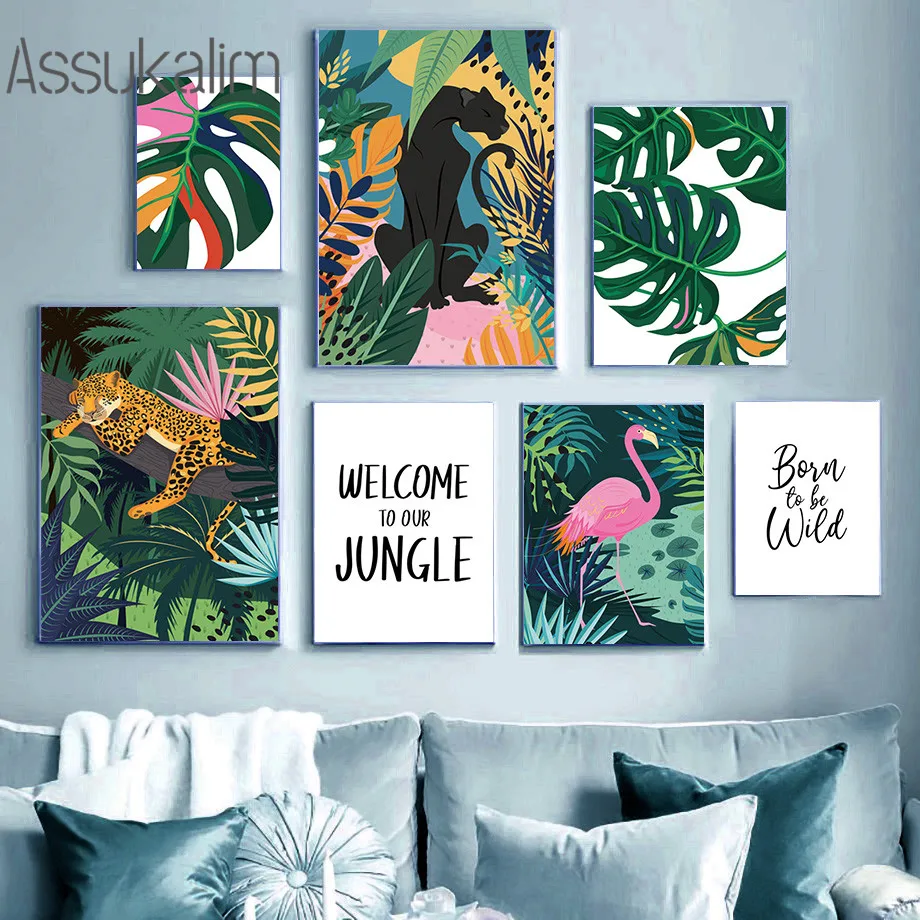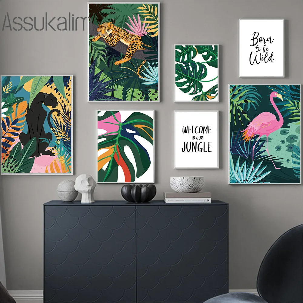Настенная картина с изображением лесных животных на холсте, постер с тропическими растениями и леопардовым принтом, постеры с фламинго, цитаты, картины для гостиной