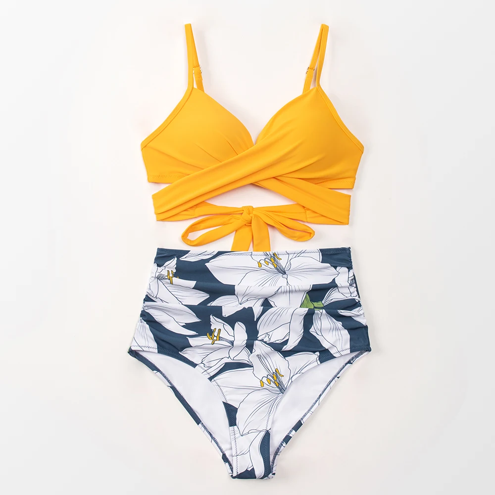 Купальник бикини женский желтый с цветочным принтом и высокой талией