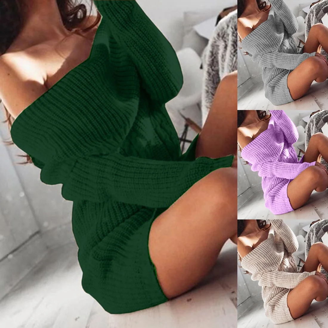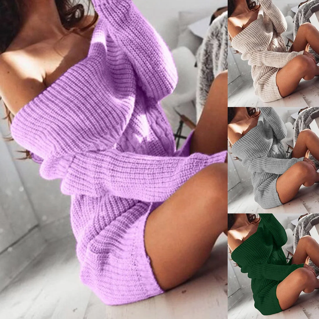 Женское трикотажное платье-свитер, с открытыми плечами, с длинным рукавом, осенне-зимнее, свободное, однотонное