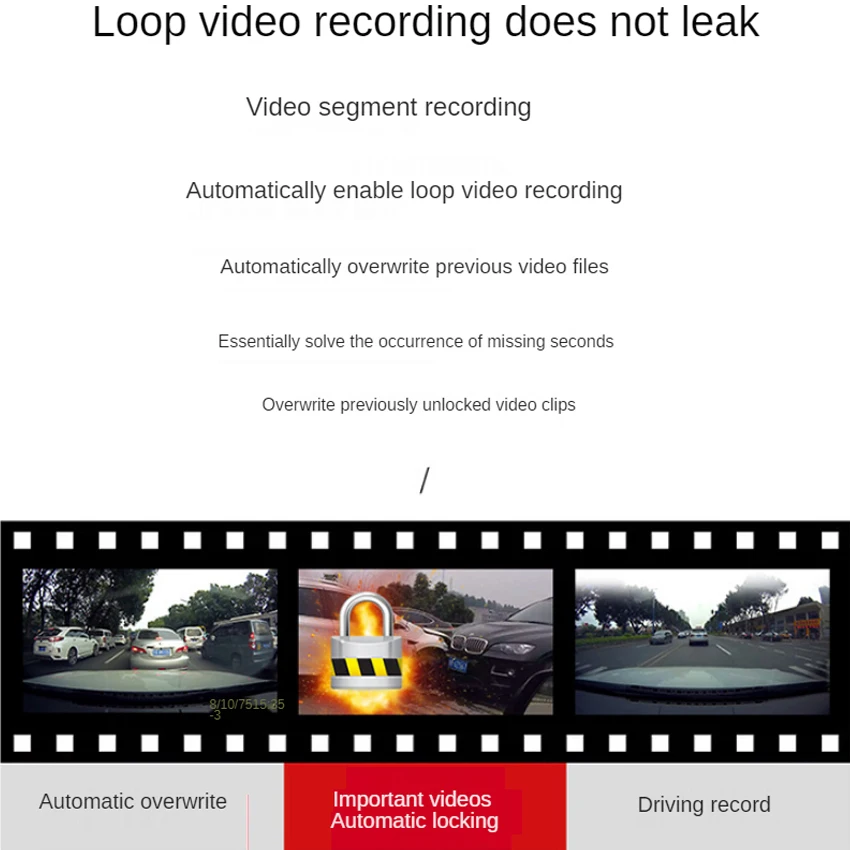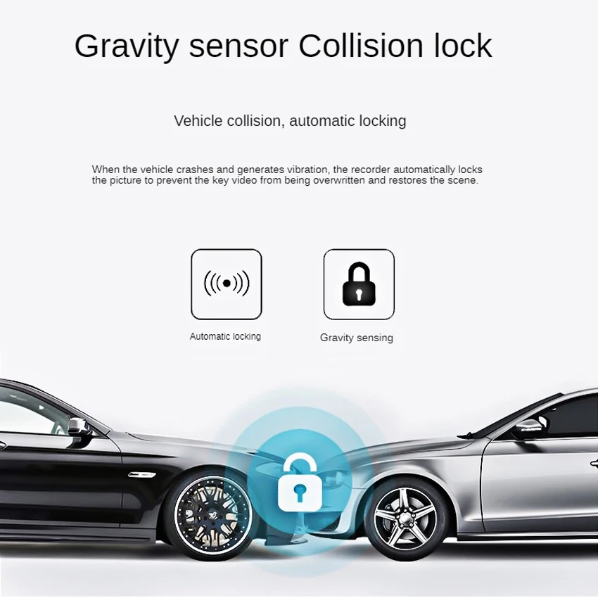 Столкновения транспортного средства, автоматическая блокировка Когда транспортное средство разбивается и генерирует вибрацию, регистратор автоматически фиксирует изображение, чтобы предотвратить перезапись ключевого видео и восстановление сцены.