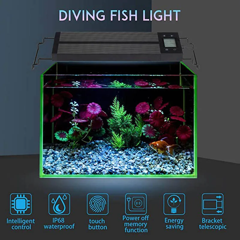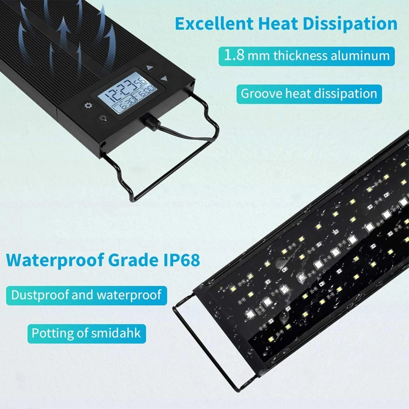 * Высокотехнологичный ЖК-цифровой контроллер дисплея, легко устанавливается и проверяется цвет и яркость аквариума рыбный светильник. IP65 Водонепроницаемый и легко моется и протирается, нет ничего страшного, когда огни аквариума выпадают в воду в течение короткого времени.