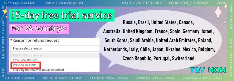 Мы предлагаем 15-дневная пробная подписка на нашей продукции в центре сообщений в течение 24 стран, с надписью «if you don't like, что товар, который вы получите, просто верните его, и вы можете получить полный возврат! Но не забудьте выбрать «личные причины» в качестве причины для спора, чтобы вам не пришлось платить за доставку и получить полный возврат, когда вы вернете его! (По другим причинам Вам может быть предъявлена высокая стоимость доставки.)