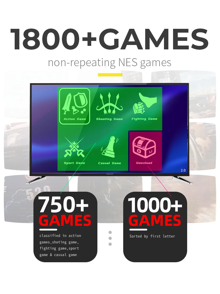 Вам нужно только подключить консоль игровой консоли к выходному интерфейсу HDMI телевизора, и вы можете играть немедленно! Простая эксплуатация без сложного процесса использования!Эта игровая консоль Dendy (Dendy) добавила более 1800 игр NES. Вы можете скачать свои любимые игры NES самостоятельно! Самое главное, мы используем другую tf-карту и добавили для вас 500 + русских игр!