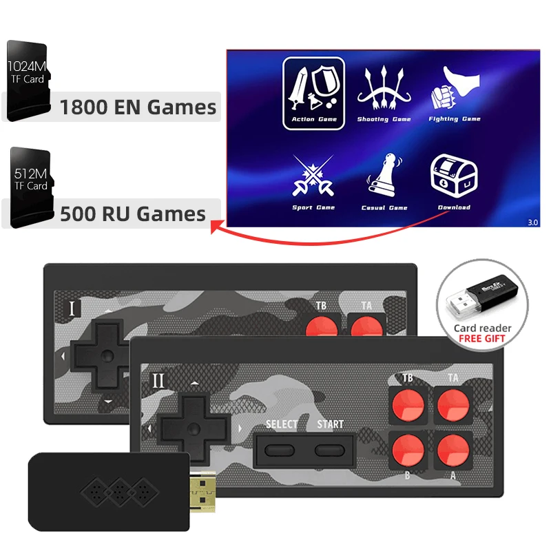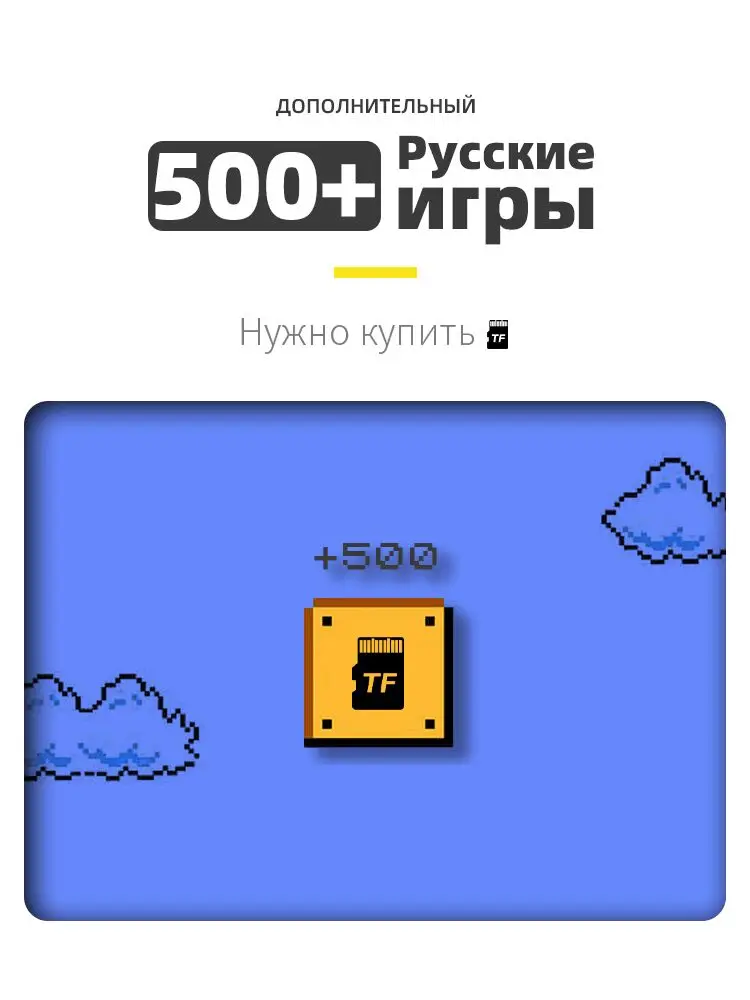 Если вы покупаете модель с русскими играми, Вы получите 2 sd-карты, одна из которых построена в 1800 английских играх с 1 Гб sd-карты, другая-sd-карта 512 М, построенная в 500 русских играх, если вы хотите играть в русские игры, пожалуйста, замените 512M sd-карту и откройте ее в" Загрузите «папку страницы меню!