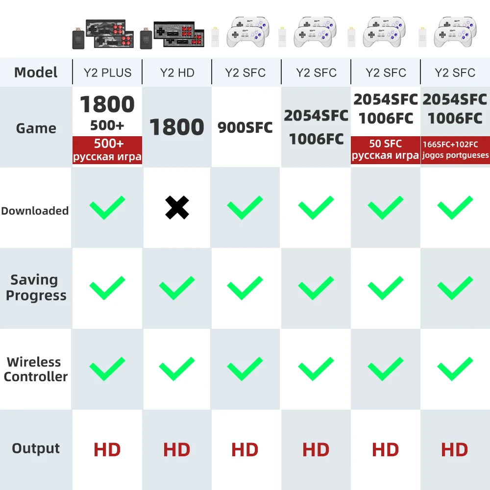 Noice:Y2S HD игровые консоли не поддерживают загрузку игр. Поддержка игровых консолей серии Y2S HD Plus. Последняя консоль Y2 SFC, с поддержкой двух эмуляторов для SFC/FC, а также поддержка русского и португальский языка! Для получения подробной информации, пожалуйста, проверьте таблицу сравнения ниже.