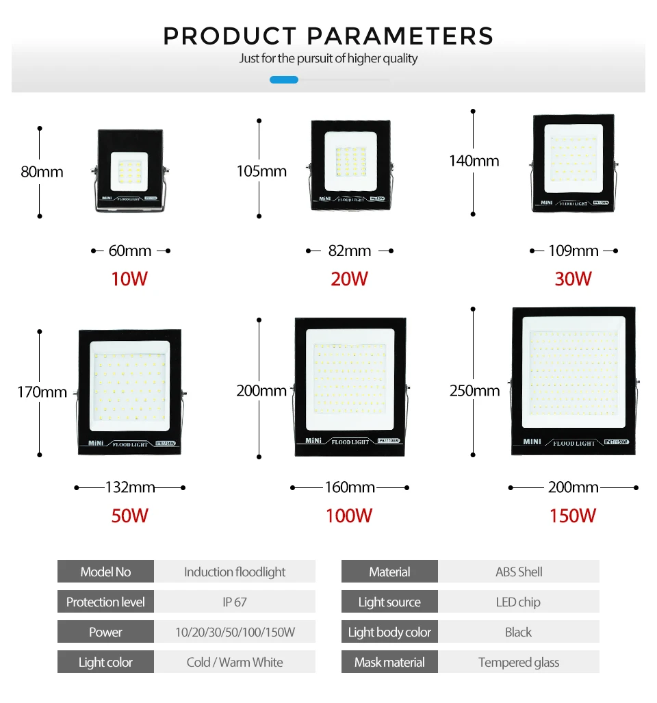 Характеристики:Название продукта:Светодиодный прожектор высокой яркостиМощность:10 Вт/20 Вт/30 Вт/50 Вт/100 Вт/150 ВтНапряжение:220VЛюмены:(10 Вт) 900LM / (20 Вт) 1800LM / (30 Вт) 2700LM / (50 Вт) 4500LM / (100 Вт) 9000LMЦвет СВЕТОДИОДА:Холодный белый/теплый белыйКоличество чипов:12/24/36/64/108/180 штВодонепроницаемость:IP67 (не помещается в воду)Светодиодный чип:2835SMDМатериал:Абс + алюминийМатериал маски:Закаленное стеклоУгол освещения (градусы):180 градусов