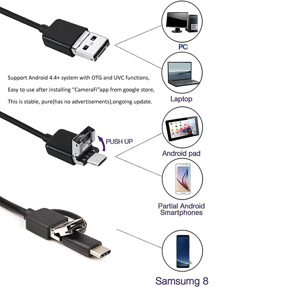 注意: 1.本相机仅适用于Android系统手机 (4,0 以上),不支持iOS系统 100% 支持PC系统 2.请确保您的手机支持OTG功能并兼容UVC(USB视频设备类)在购买之前.因为有些手机可以屏蔽外置摄像头.(目前大部分安卓设备版本都有此功能,如果您不确定是否适合,请在购买前先确认)订购前请仔细检查您的手机,否则由于上述原因我们将不承担任何责任.