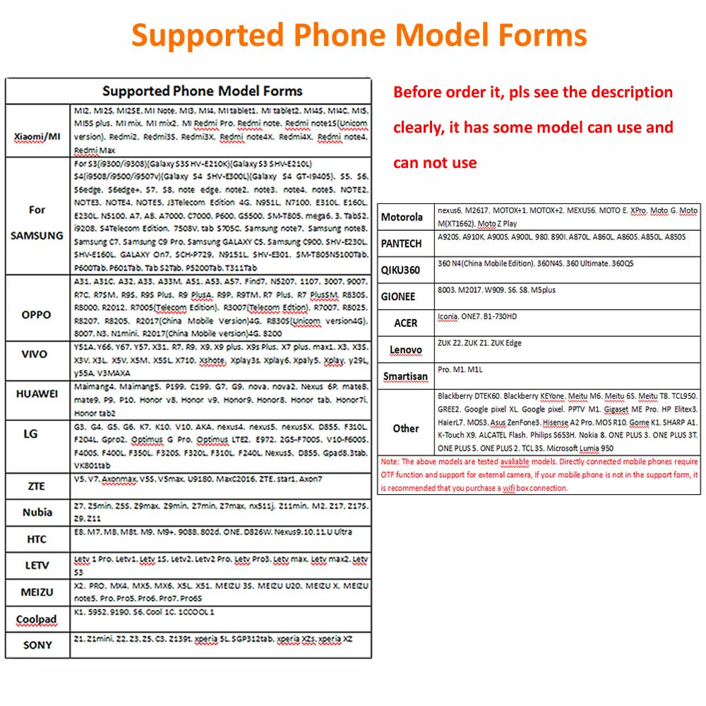 Примечание: Вышеуказанные модели тестируются на доступных моделях. Для непосредственно подключенных мобильных телефонов требуется функция OTF и поддержка внешней камеры, если ваш мобильный телефон не находится в форме поддержки, рекомендуется приобрести соединение с wifi.