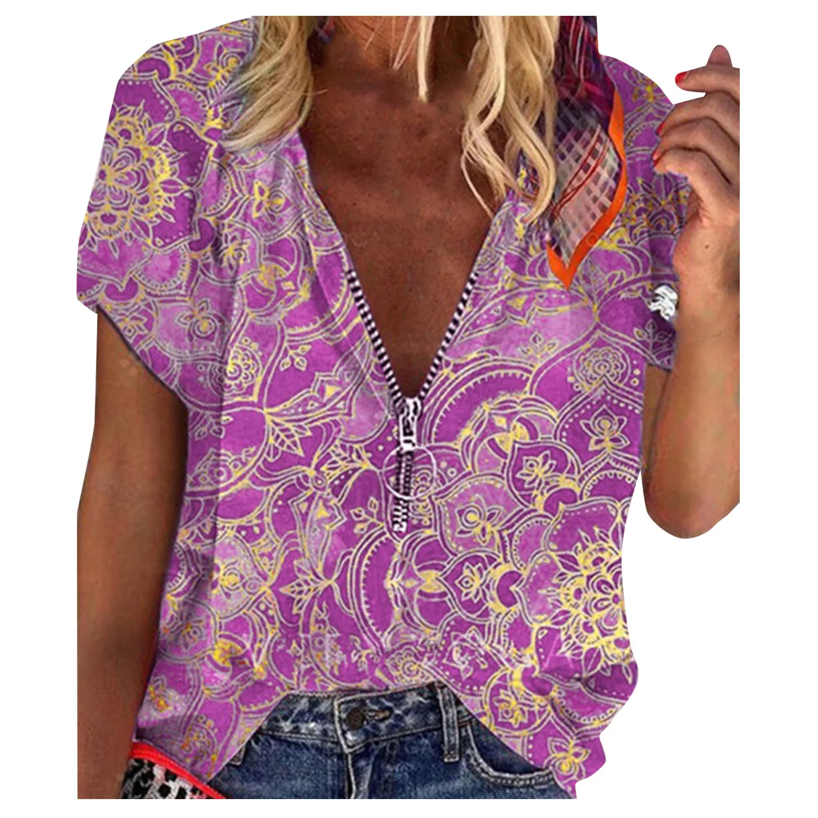 Женская летняя модная Свободная рубашка с короткими рукавами и v-образным вырезом на молнии