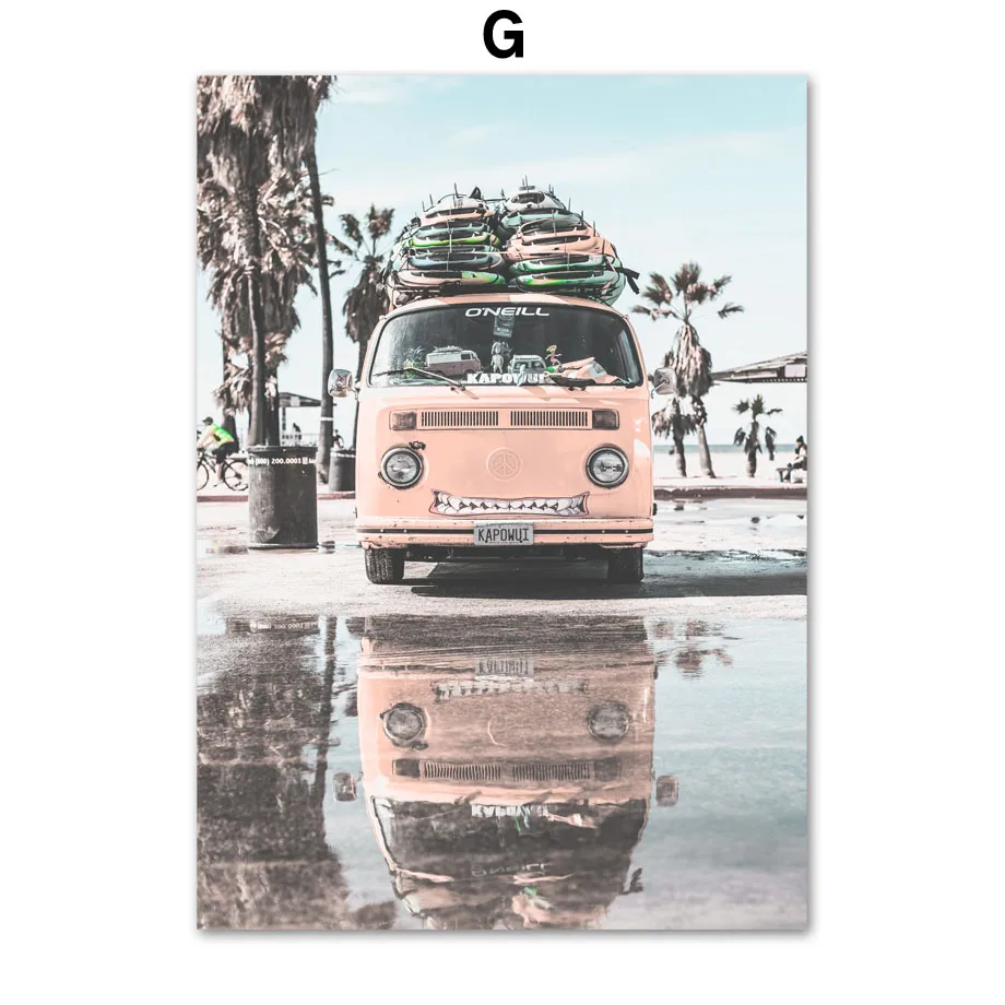 Настенная картина Sunny Beach с автобусом, серфингом, пальмами, Кар...