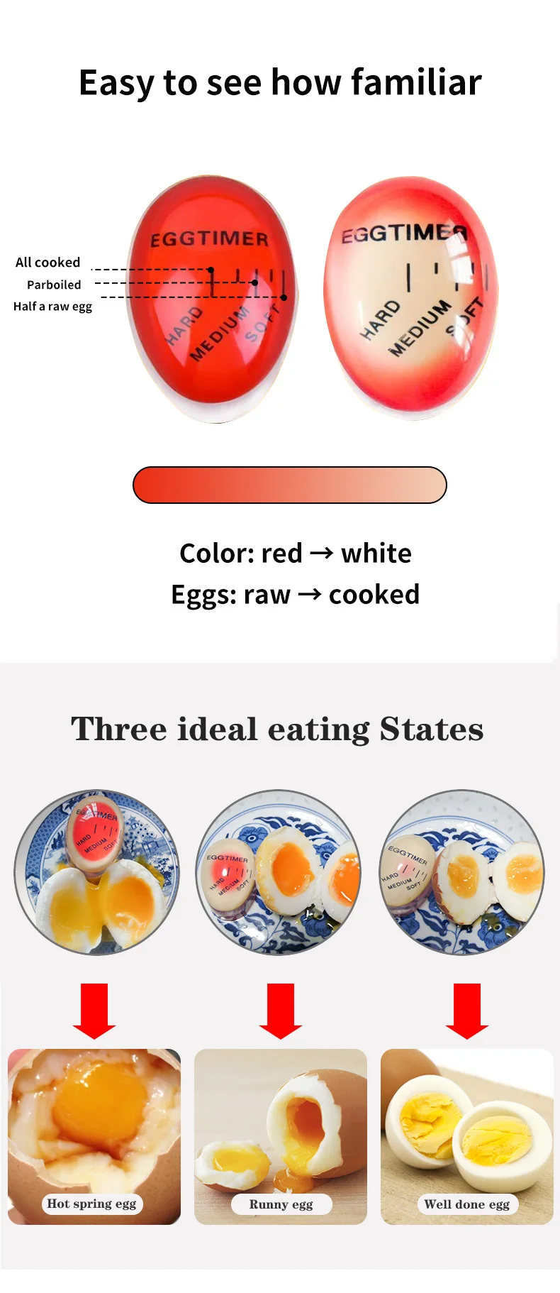 Термочувствительный. Градуированные весы показывают, когда яйца мягкие, средние или твердые, путем измерения тепла вместо времени. Мягкие вареные яйца-именно такие, какие вам нравятся. Твердые вареные яйца больше не перевариваются, поэтому они обладают идеальными цветными желтками и гладкой текстурой. Таймер для яиц можно охлаждать на прилавке. Не погружайте яйцо в холодную воду.