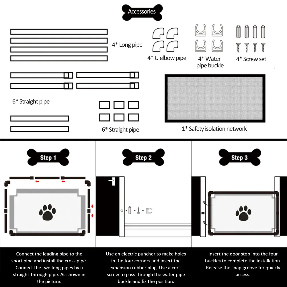 Название: изоляционная сетка для детского дверного забора, безопасная сетка для домашних животныхКлючевые слова: внутренние ворота, детские ворота, ворота для домашних животных, Детские ворота безопасности, ворота для домашних животныхЦвет: черныйРазмер: около 100*80 см/39,37*31,50 дюймаМатериал: армированное волокно + полиэтиленВес брутто: около 950 гПримечание: Рекомендуемый диапазон установки составляет в пределах 98 см.Аксессуары:1 * защитная сетка4 * Длинная Трубка6 * прямая труба6 ПРЯМЫХ ПВХ4 * U локоть4 * Пряжка для водопровода4 * набор винтов или клейкая пряжка
