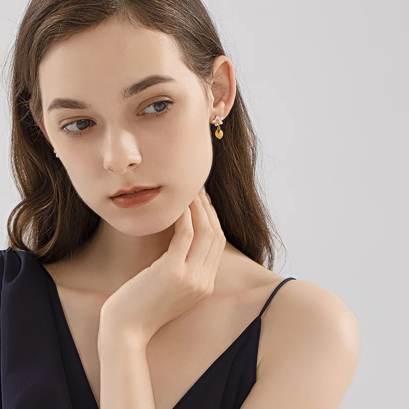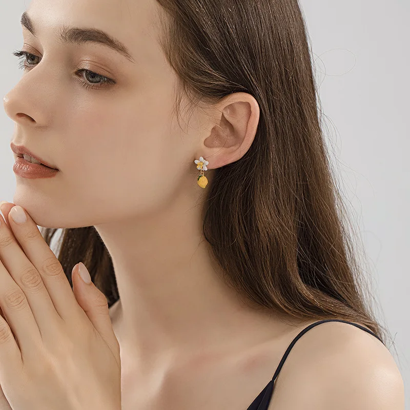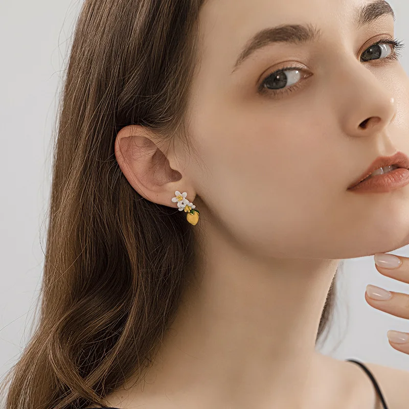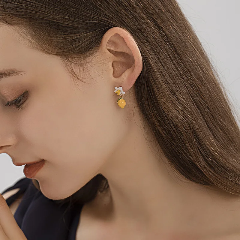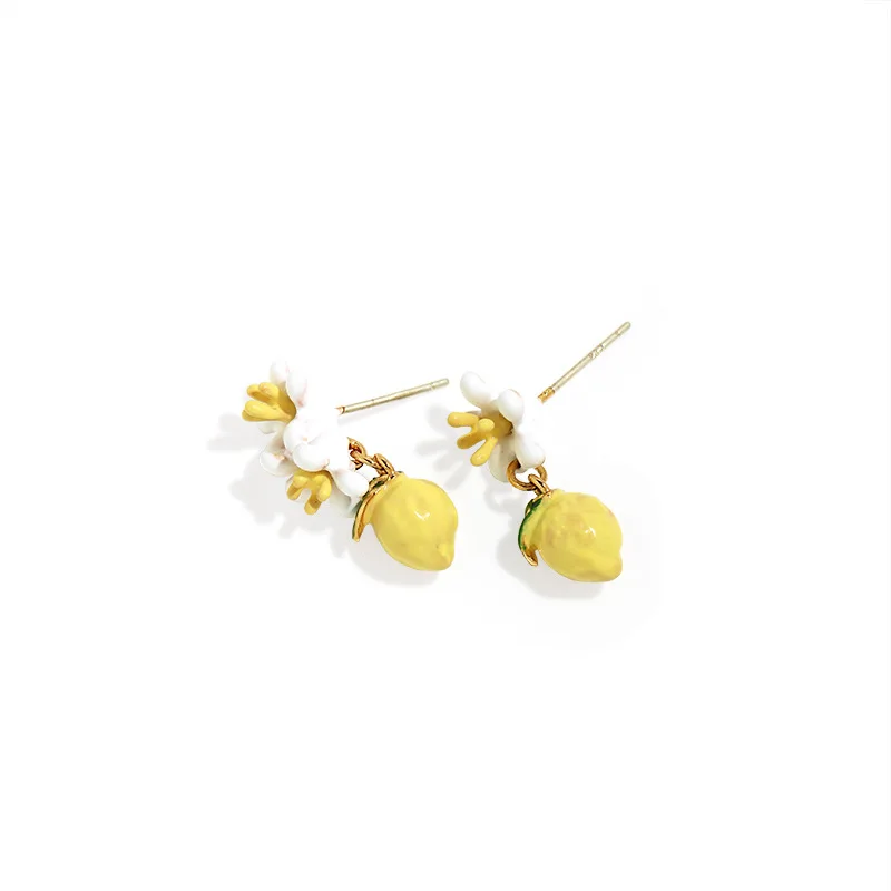 Серьги-гвоздики с изображением свежего лимона, эмалированные асимме...