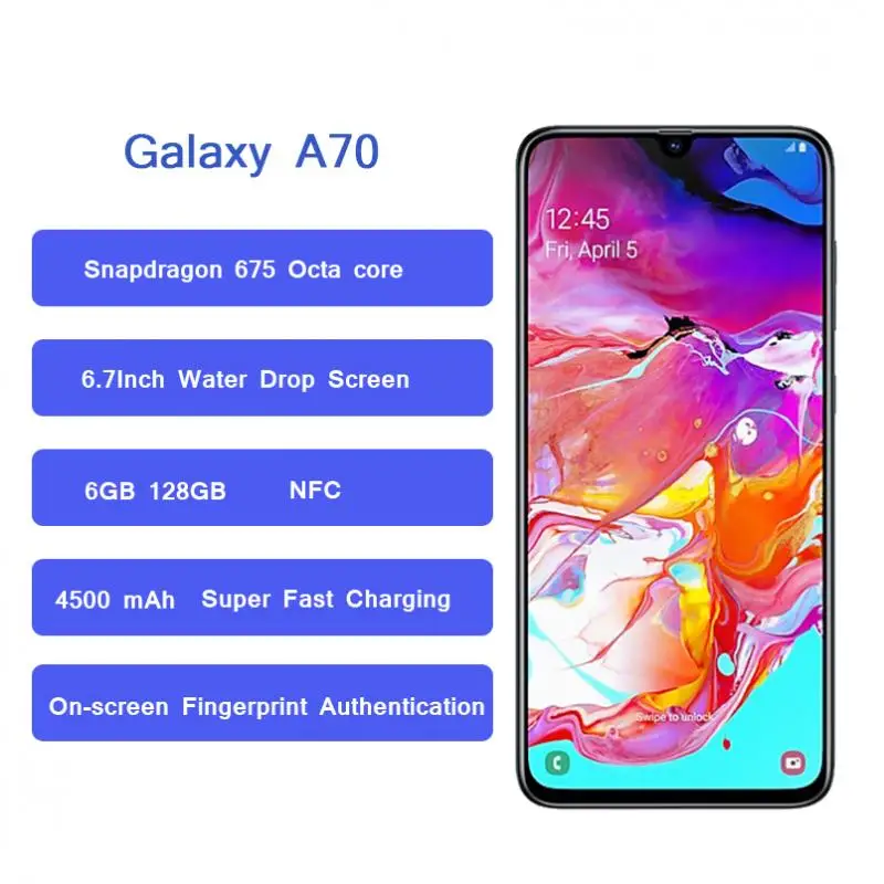 Сотовый телефон Samsung Galaxy A70 A7050, две Sim-карты, 6 ГБ8 ГБ ОЗУ, 128 Гб ПЗУ, мобильный телефон дюйма, Восьмиядерный процессор Snapdragon 6,7, 4 камеры, NFC