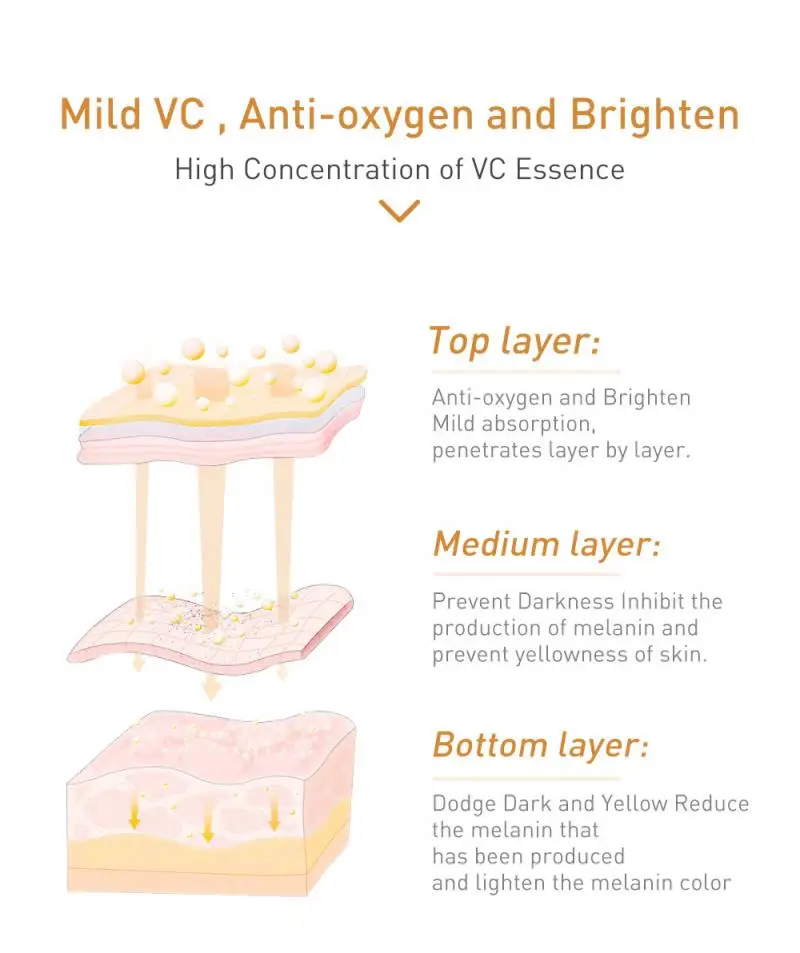 Содержит богатый VC, эффективно осветляет вашу кожу, устраняя меланин пигмент.