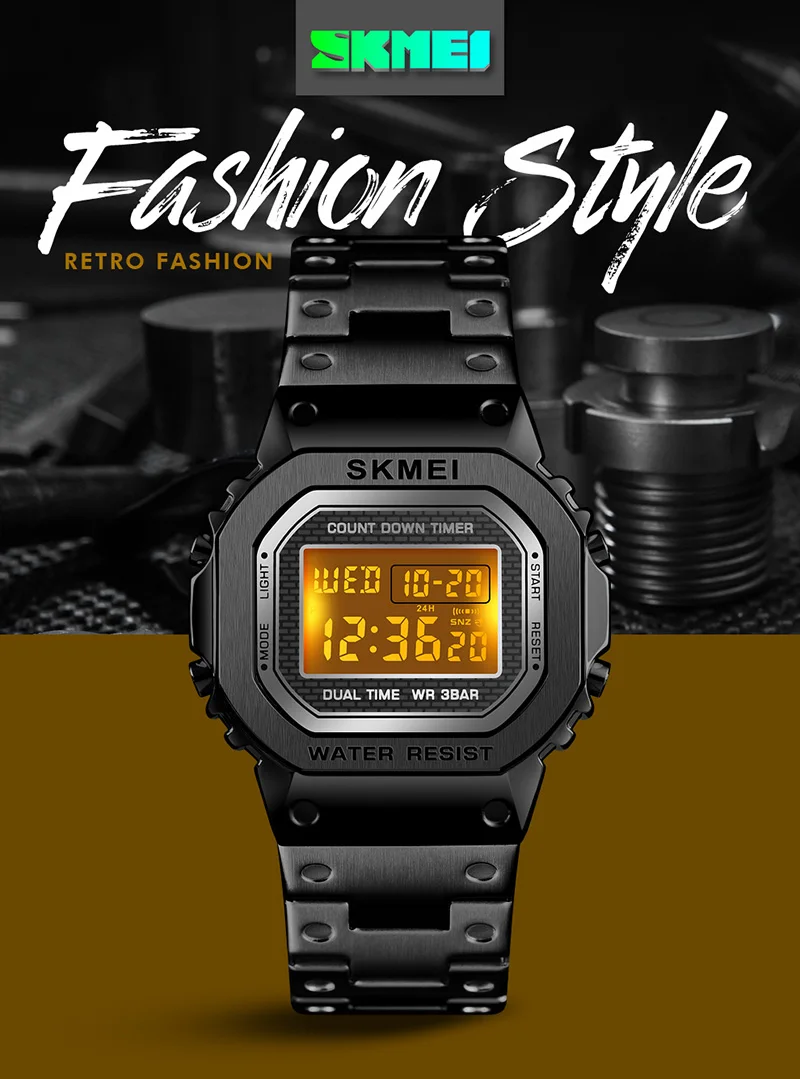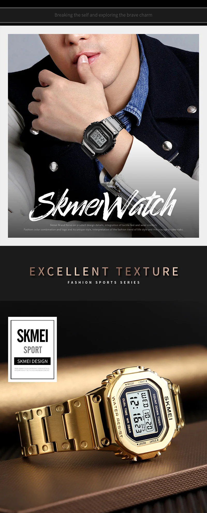 Часы наручные SKMEI мужские и женские, маленькие золотистые водонепроницаемые квадратные электронные с стальным ремешком и будильником, в стиле ретро, 1456
