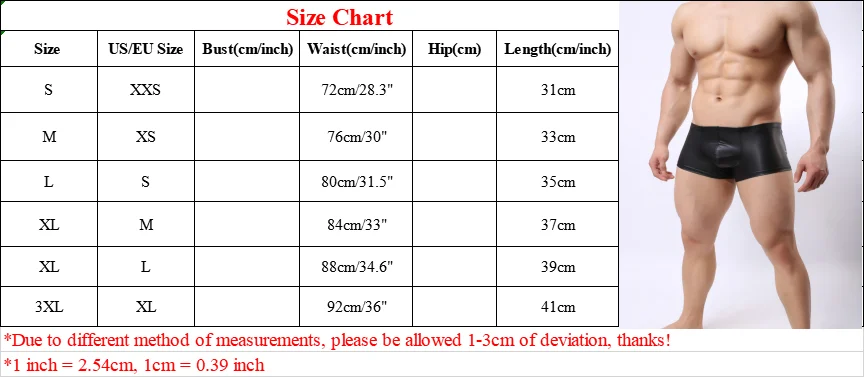 Особенности: Материал: лакированная кожа Размер: S, M, L, XL, XXL, 3XL (пожалуйста, обратитесь к таблице размеров для фактического размера s). Пожалуйста, будьте строго следуем правилам в нашей таблице размеров и убедитесь, что эти фактические измерения подойдут вам.(1 дюйм = 2,54 см) Цвет: Черный Упаковка включает: 1 шт. из серии пикантной кожаной обуви с багажник