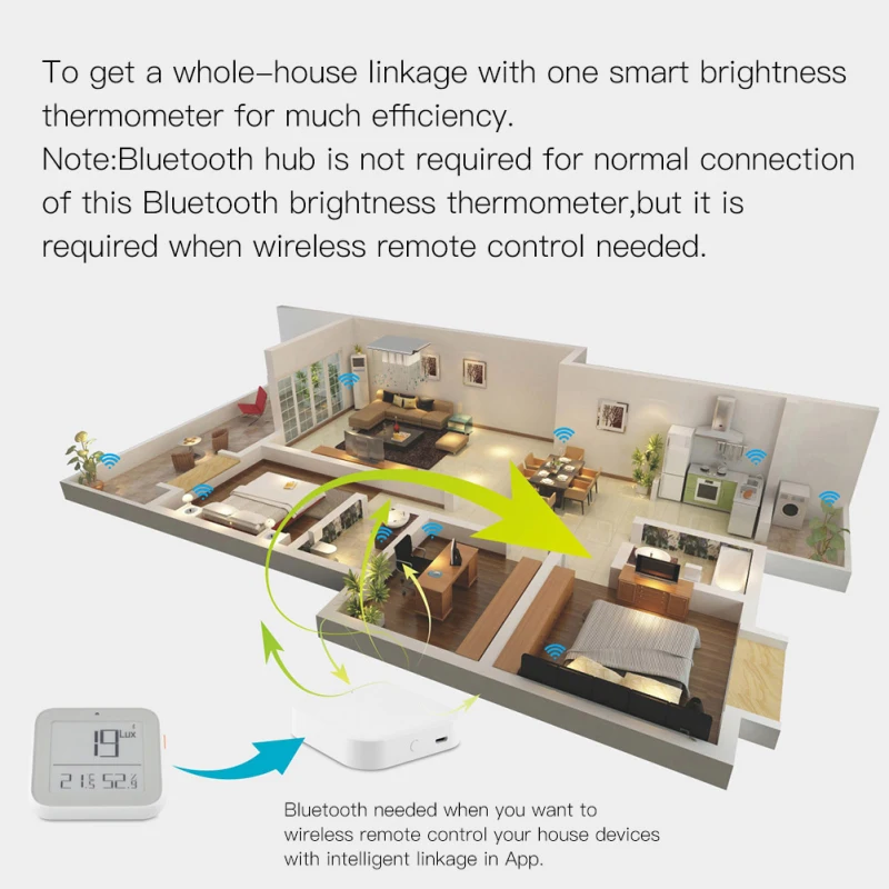 5. Концентратор шлюза Bluetooth является обязательным для этого датчика температуры и влажности яркости Bluetooth, когда необходим беспроводной пульт дистанционного управления, и концентратор не требуется, когда для сопряжения только в приложение, используется как центр управления для умного дома. (Концентратор Bluetooth не входит посылка.