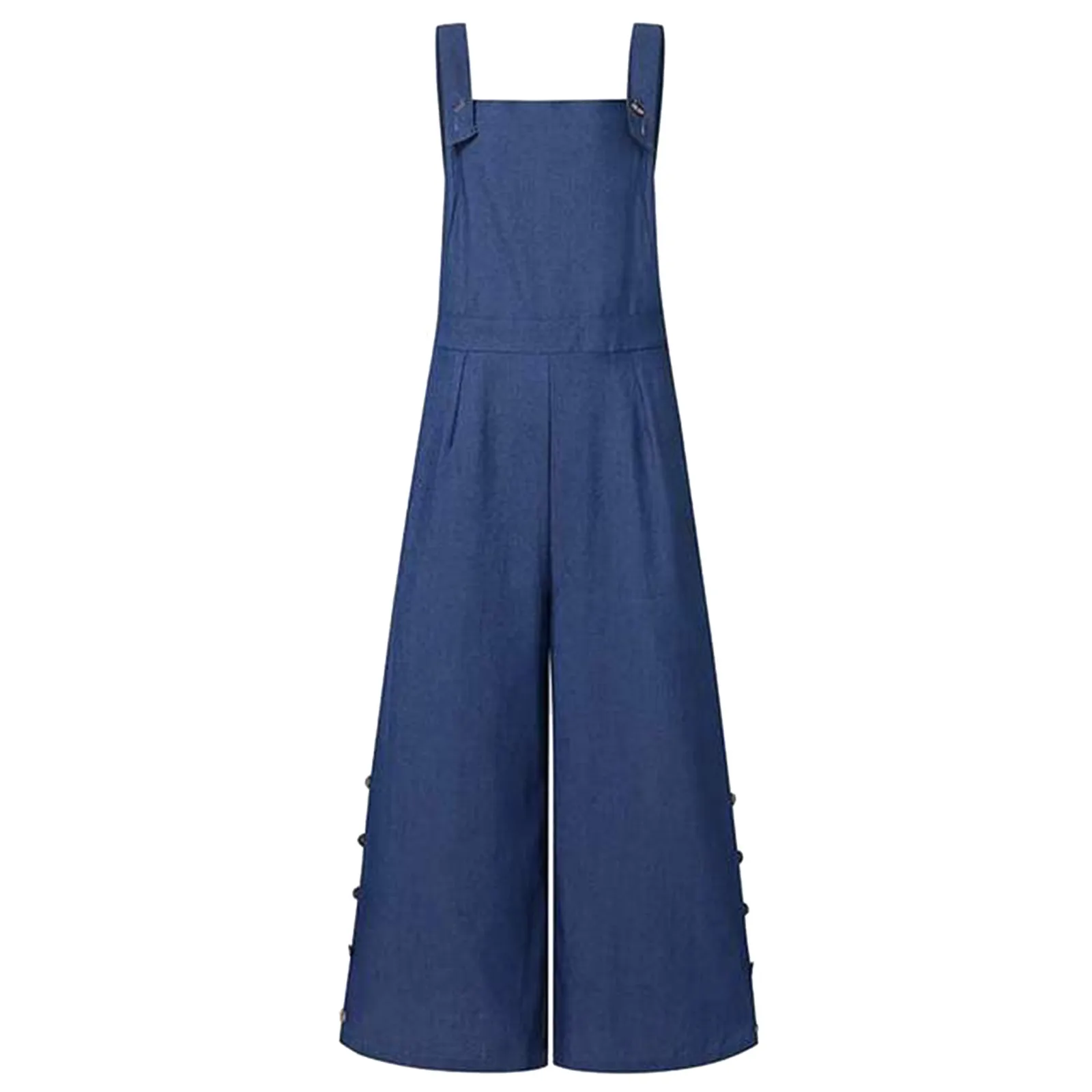 2021 женские комбинезоны без рукавов, джинсовый комбинезон на пуговицах, повседневный однотонный Летний комбинезон с широкими штанинами, женский комбинезон