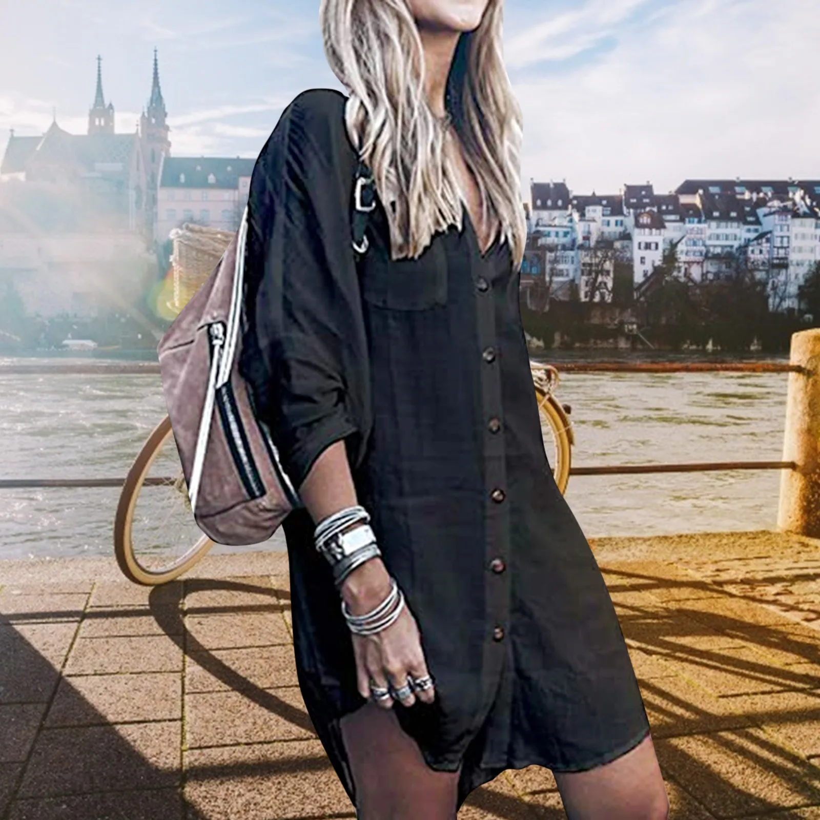 Женское модное повседневное однотонное платье с V-образным вырезом и карманом с длинным рукавом пляжная, с пуговицами
