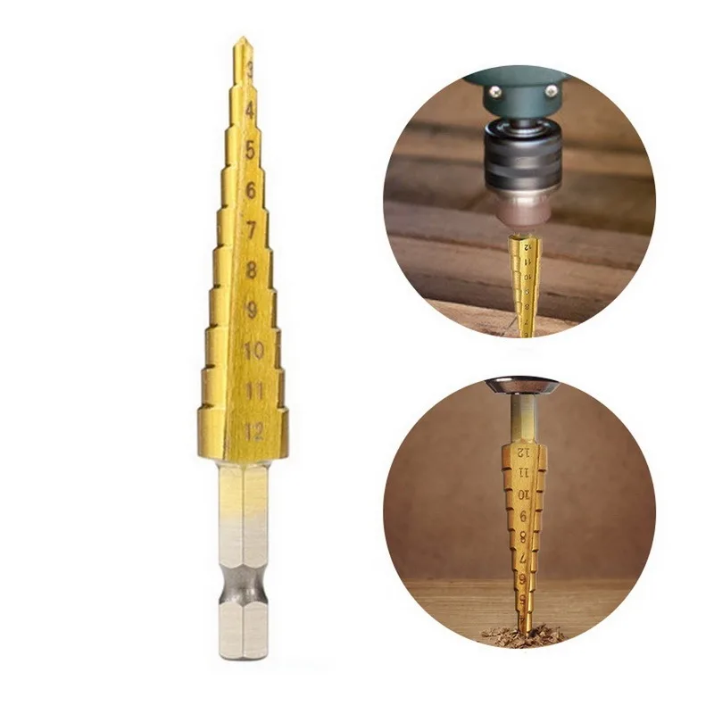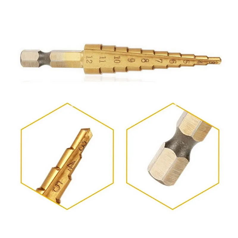 Особенности:** Широко используется: ступенчатое сверло может сверлить в пластике, алюминии, меди, нержавеющей стали и многих других типах листового металла.** Материал хорошего качества: Высокоскоростная сталь с титановым покрытием хорошо подходит для большинства применений общего назначения, предлагая сочетание твердости и прочности для износостойкости, долговечности и долговечности** Титановое покрытие: титановое сверло с титановым покрытием для круговой работы, может эффективно продлить срок службы сверла.** Ступенчатое сверло: уникальный дизайн бит с лестничной структурой, ступенчатое сверло может использоваться для открытия отверстий различных размеров.** Хорошая производительность: наконечник с разделенной точкой увеличивает скорость резки с самоцентрированием и предотвращает ходьбу. Двухфлейтовый дизайн быстрее очищает чипы и позволяет частицам легко, плавно резать.** Применение: может точно сверлить металл, дерево, сталь и пластик, другие поверхности** Размер: Размер бит s включает 3 мм, 4 мм, 5 мм, 6 мм, 7 мм, 8 мм, 9 мм, 10 мм, 11 мм, 12 мм