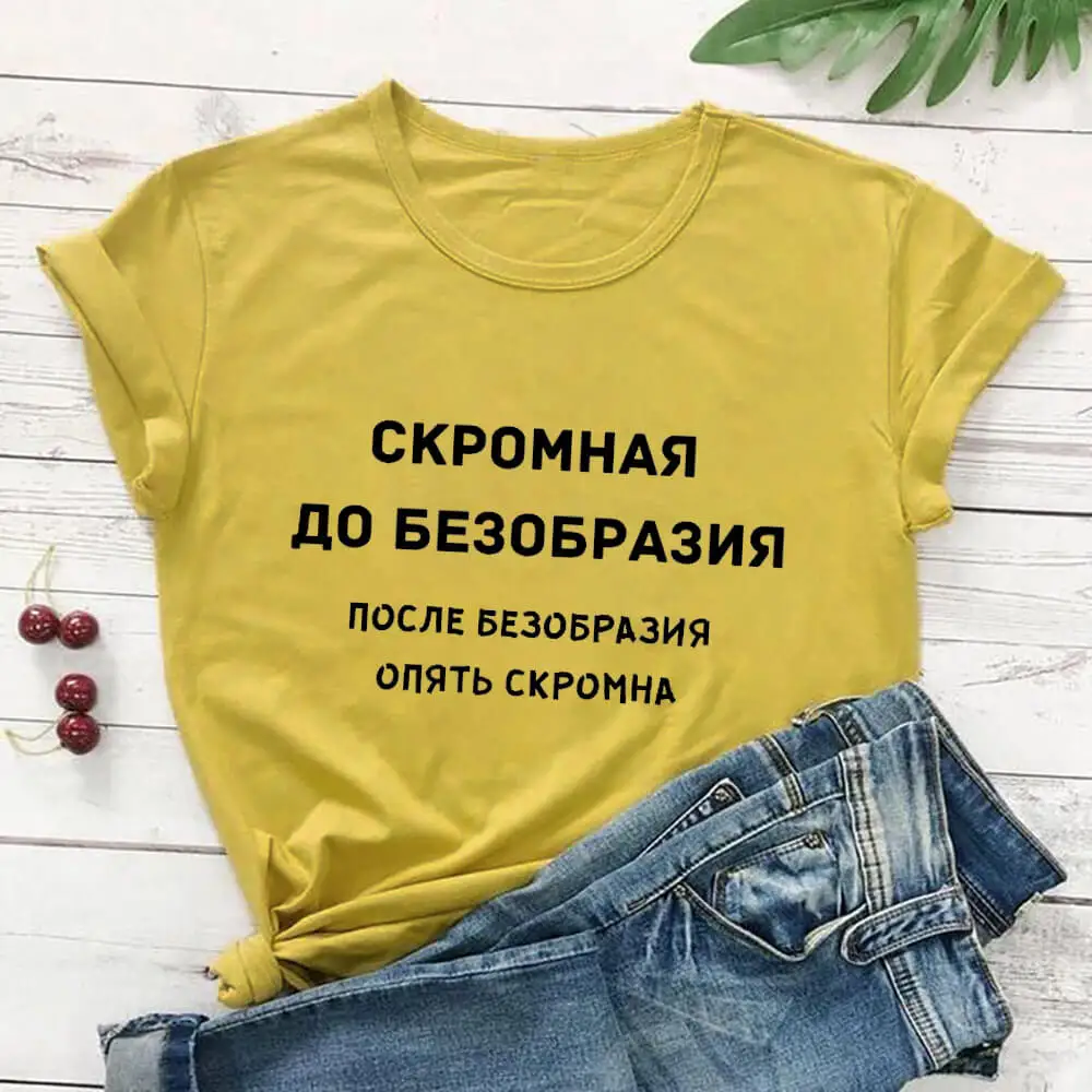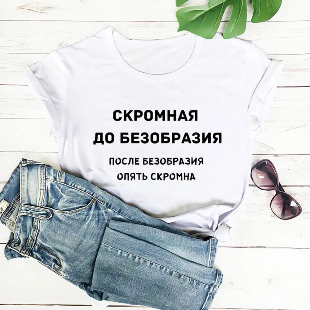 Скромная до безобразия после безобразия опять скромна русской кириллицей 100% хлопок женские футболки для мальчиков и девочек Летняя повседневная одежда с О-образным вырезом, с коротким рукавом, топы, футболки