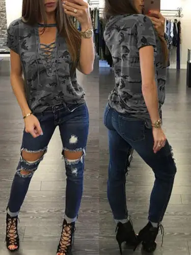 Женская камуфляжная бандажная футболка, летние топы с глубоким V-об...