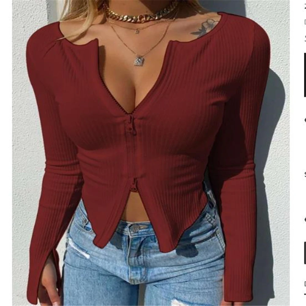 Женская футболка, сезон весна-осень, одежда, ребристый ТРИКОТАЖНЫЙ УКОРОЧЕННЫЙ ТОП с длинным рукавом, дизайнерская футболка на молнии, привлекательные женские облегающие черные и белые топы