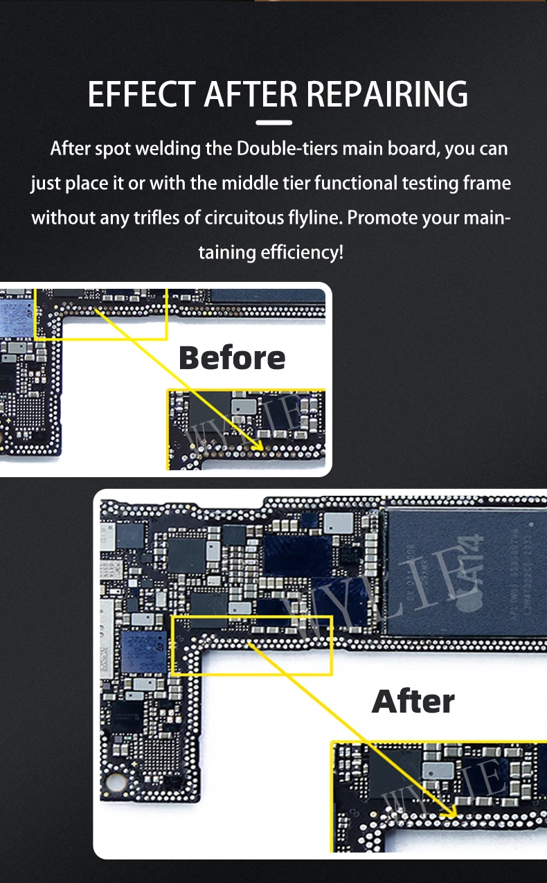 Новая эра Flyline. WYLIE точечный ремонтный паяльный наконечникПодходит для сварочных пластин различных размеровРемонтные точки быстро высокоэффективные/стабильныеНовые концепции летучей линии. Повышение эффективности поддержанияРазличные формы и модели пайкиПодходит для точечно-выцветших сварочных пластинДля замены традиционной линии flyline. Бесшовный ремонтС эффектом оригинальной сварочной пластины. Для украшения пластины с бесшовным ремонтомПосле точечной сварки Двухуровневая основная плата, вы можете просто разместить ее или с функциональной испытательной рамкой среднего уровня без каких-либо мелочей схемной линии flyline. Повышает эффективность вашего обслуживания!Оторвите слой покрытия и отремонтируйте сварочные пластины прямо сейчас!В поддержании промышленности точки сварочных пластин часто выцветают из-за падения, тряски или сдавливания.(В комплекте телефонная основная плата IC сварочные пластины или двухъярусная материнская плата среднего уровня/CPU/WIFI/жесткий диск/большая частота/трогательный IC и так далее)Сделайте сварочные пластины более стабильными и восстановите эффект, как оригинал!
