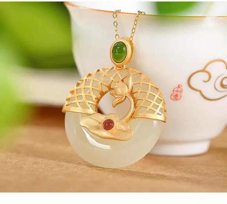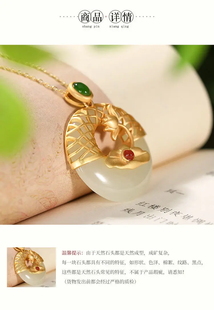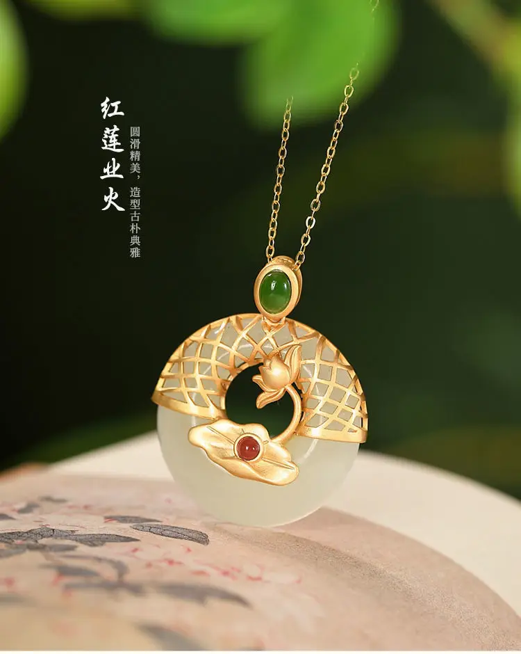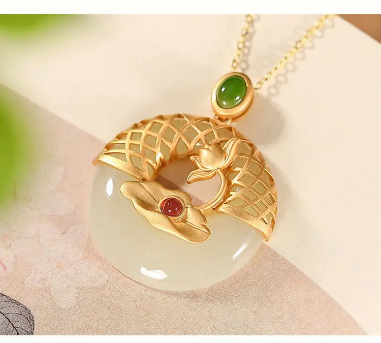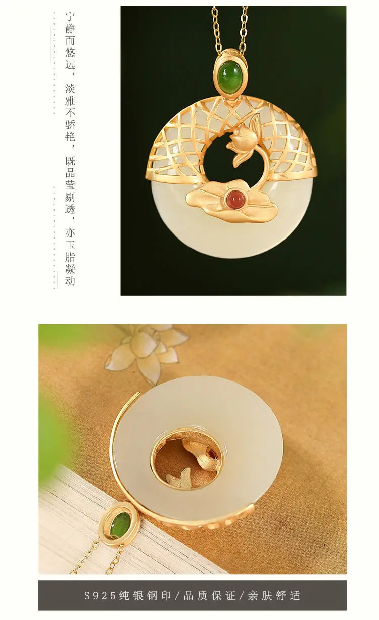 Новый S925 стерлингового серебра позолоченные натуральный Hotian и Нефритовой подвеской, в стиле ретро; В китайском Lotus Peace Пряжка Женская цепочка на свитер