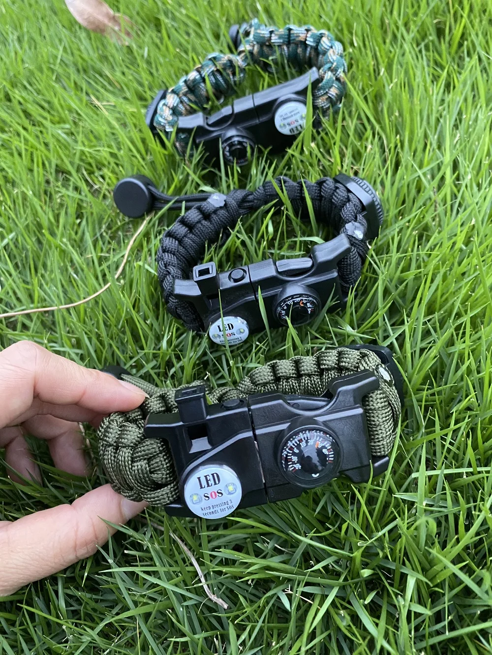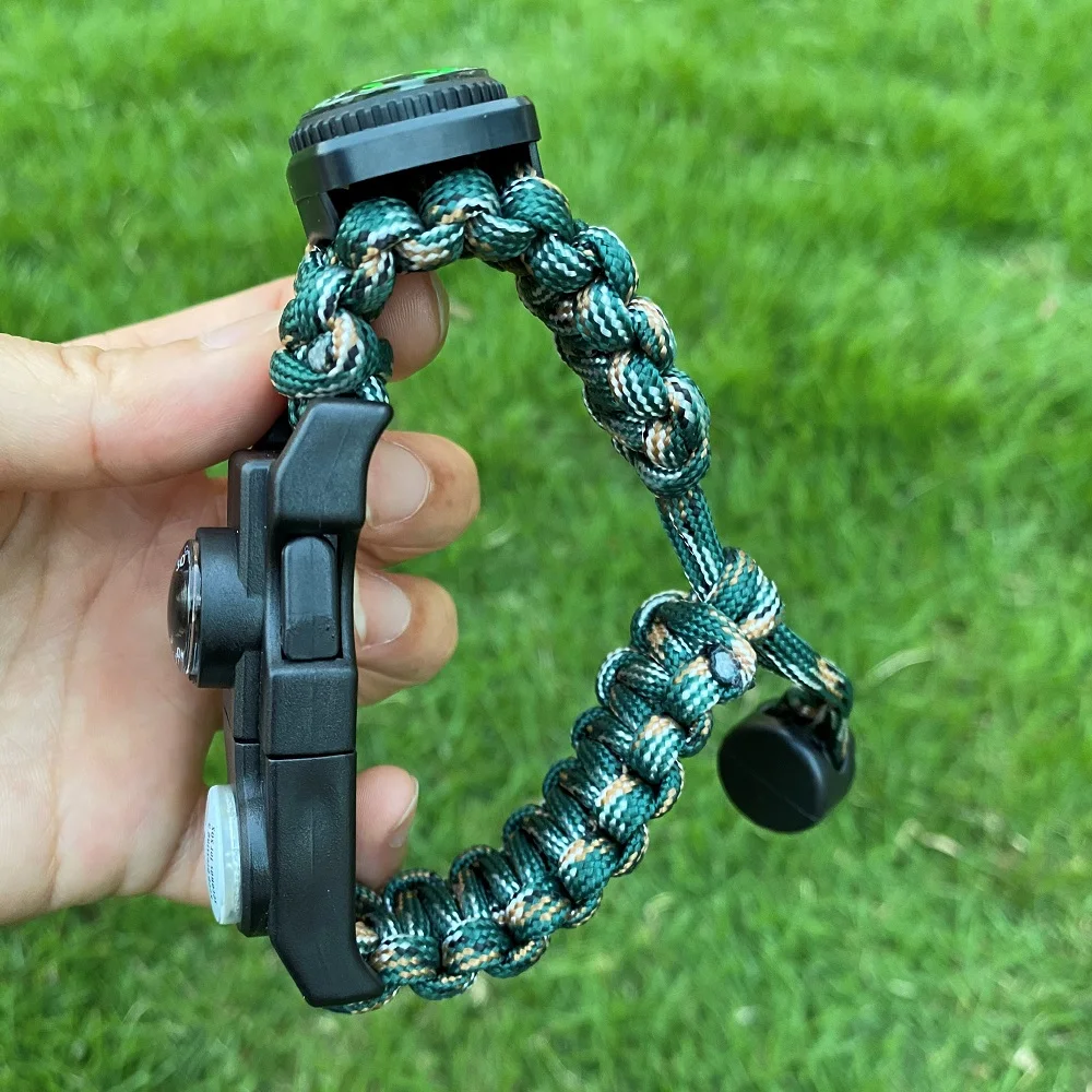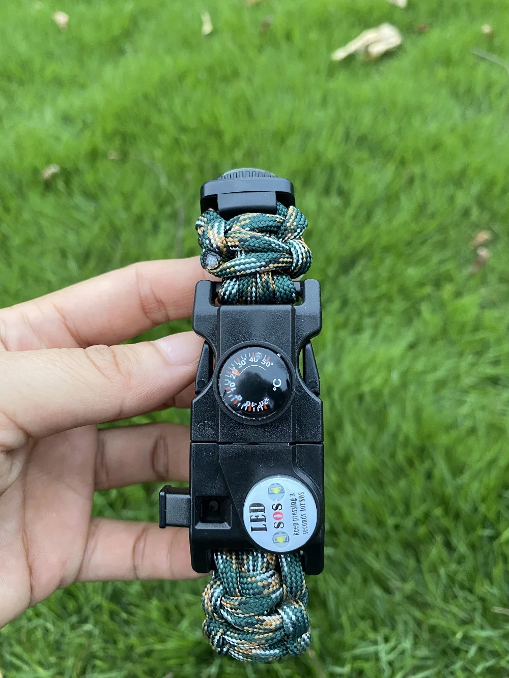 Он включает в себя больше инструментов для выживания: обновленный компас, светодиодный светильник SOS, свисток, карточка для инструментов, нож в форме т, термометр, носите это во время путешествий, это не только декор, но также набор для выживания
