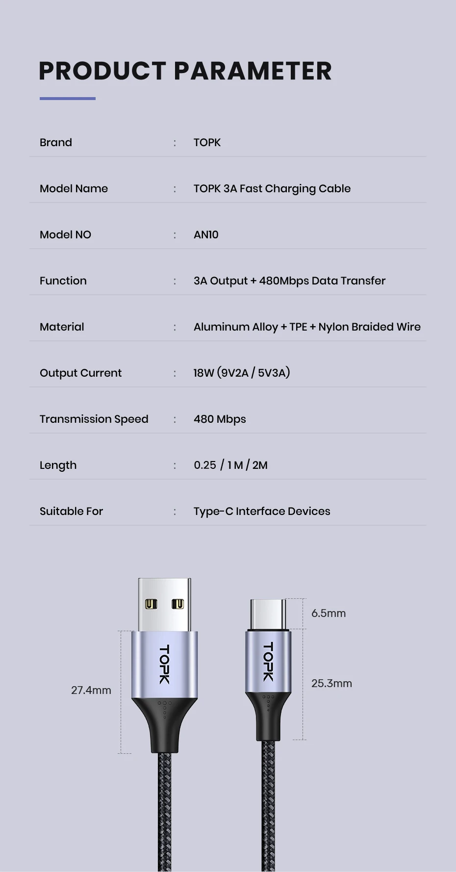 Зарядный кабель TOPK AN10, Micro USB, Type-C, 3 А