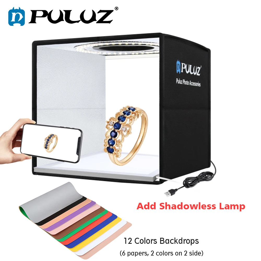 Светильник PULUZ, коробка и бестеневая лампа, набор, светильник для фотосъемки, настраиваемый светодиодный, яркость, ювелирное изделие, палатка с 12 цветами, фон