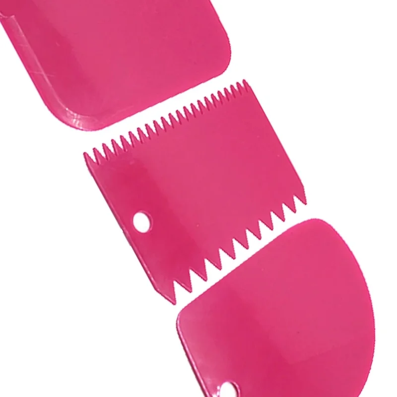 Скребок с прямыми краями подходит для удаления остатков на поверхности разделочной доски, дуговой скребок также называется скребком двойного назначения, подходит для удаления остатков углов тазового дна, скребок в форме зубов делится на большие зубцы и маленькое расстояние между зубцами, подходит для изготовления шаблонов крепления торта.