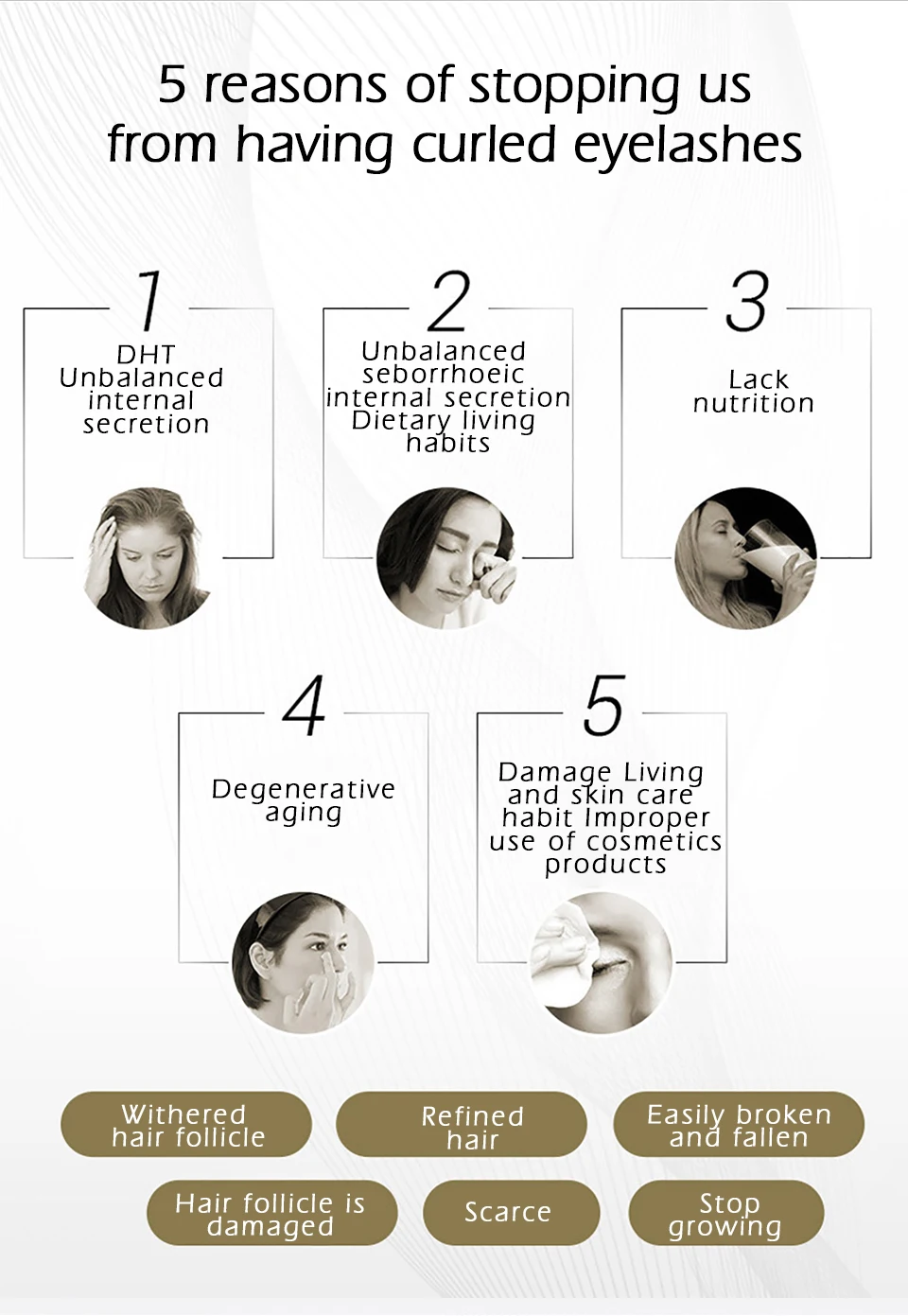 1. Ароматизаторы Myristica Myristoyl Pentapeptide-быстрое восстановление волосяного фолликула способствует естественному удлинению ресниц и эффективно уменьшает падающие феномены Сью до старения DHT. 2. Биотин-Витамин H, коэнзим предотвращает падение себорроевых ресниц способствует регенерации волос и нормальной работе. 3. Экстракт корня женьшеня 4. DDDE-способствует стабильному корню ресниц и оптимизирует корень волосяного фолликула. 5. Биотиноил Tripetide-1-улучшает экзоплазму, например, синтез коллагена IV и мукопротеина 5, и оптимизирует структуру волосяного фолликула. Хорошо подходит для укрепления волоса и волосяных фолликулов дермы.