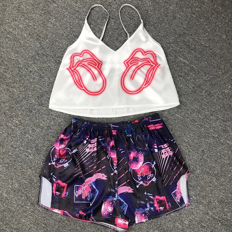 Пижамный комплект Женский атласный с мультяшным принтом, пикантная ...