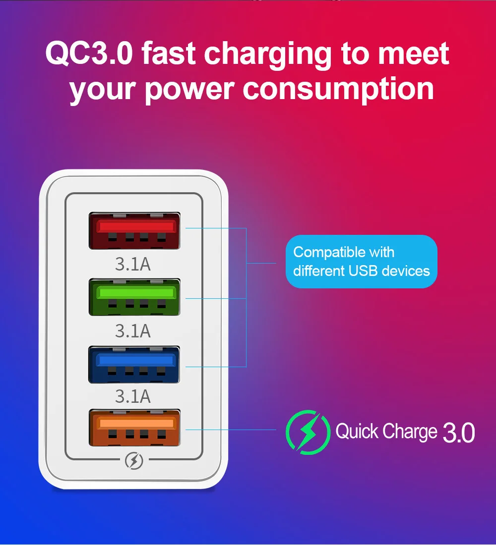 Зарядное устройство с 4 USB-портами и поддержкой быстрой зарядки, 3,0