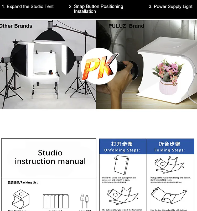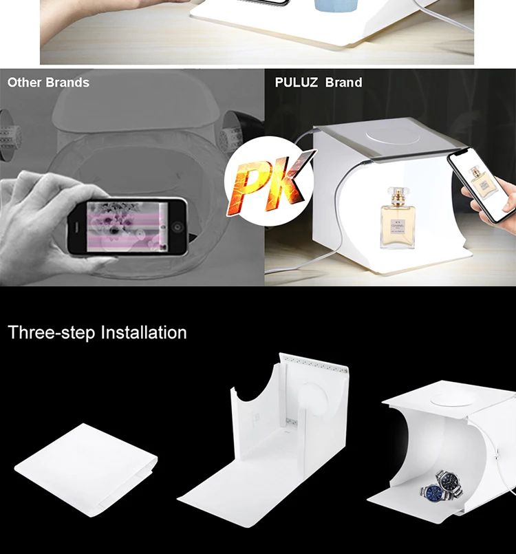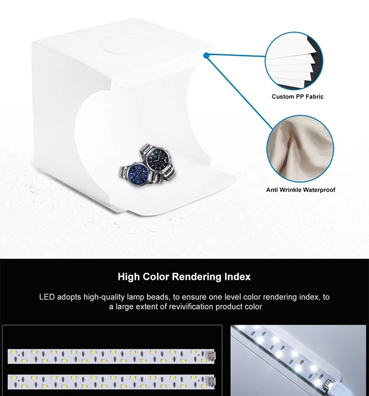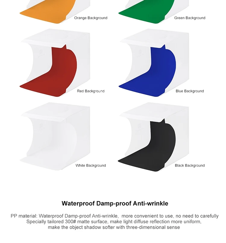Универсальная Портативная студия, простая в использовании и разборке.Светильник для фотосъемки предназначен для небольших предметов для любителей фотографии, ремесленников, художников, студентов и других онлайн-продавцов, профессионалов и клиентов по рекламе продукта.Светильник box studio позволяет быстро и легко снимать мелкие товары, такие как ювелирные изделия, аксессуары, игрушки, часы, гаджеты и другие предметы.Соберите свою собственную фотостудию в любом месте в течение нескольких минут, вы можете развернуть этот светодиодный светильник в студии и разместить его на любой поверхности, чтобы получить идеальный фон для небольшой деловой фотографии, фотографируя их.Портативная складная конструкция кнопки, более удобная в установке и переноске, Встроенный светодиодный светильник, обеспечивающий средний Светильник, предотвращает появление теней и отражений на фотографиях.С 6 панелями EVA (черный, белый, оранжевый, красный, зеленый, синий), встроенный светильник со светодиодной панелью и usb-кабель (вы должны подготовить Зарядное устройство USB, блок питания, или usb-хаб для питания).Мини и светильник-вес, только как Книга в сложенном виде, легко брать в любом месте.