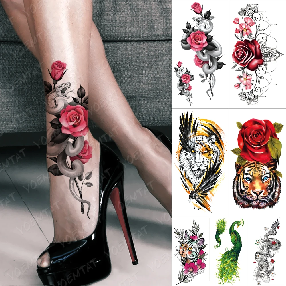Водонепроницаемая Временная тату-наклейка Роза, цветок змеи, татуировки, кружева, тигр, дракон, тело, искусство, рука, ложный рукав, тату для женщин