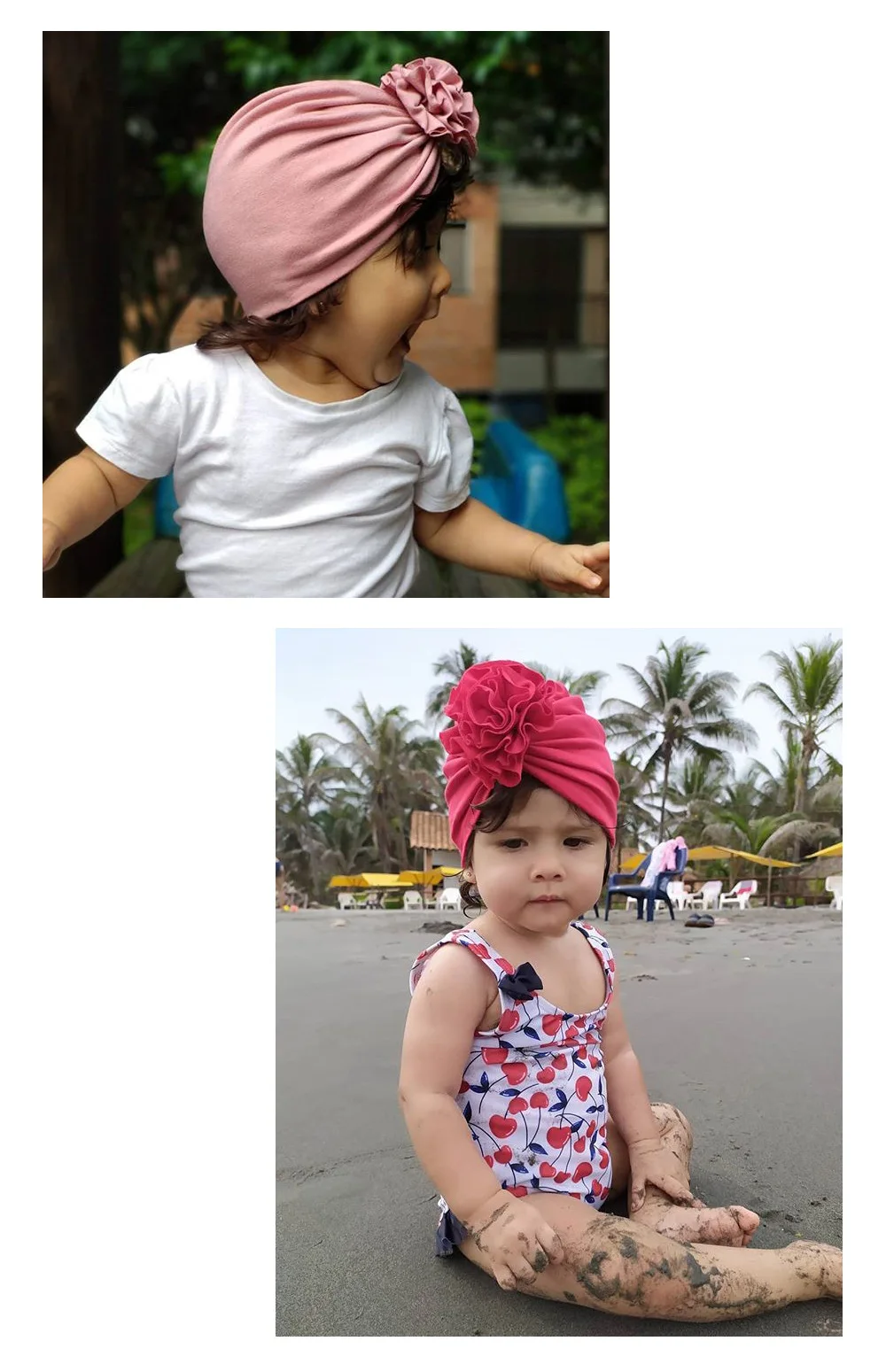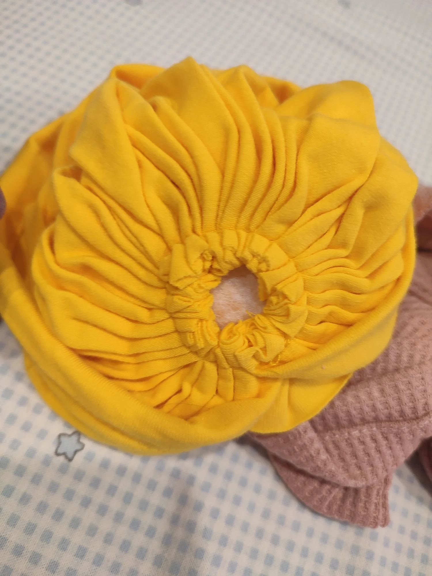 вместо бежевой прислали жёлтую, ну да ладно. заказывала 4 разные шапочки. по размеру и составу ткани все разные. на ребёнке 4 месяца сидят хорошо. но единственное очень грубо сделано место под узлом. мне кажется деткам будет давить. жёлтая хб. остальные синтетика. у некоторых края не обработаны. визуально очень красиво смотрятся на ребёнке