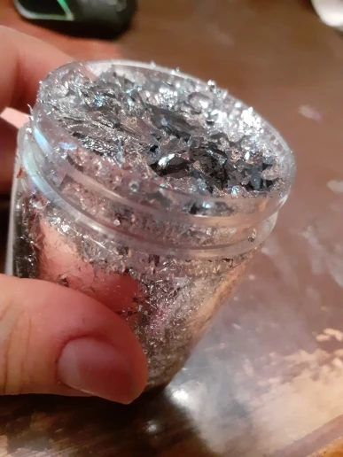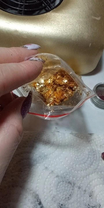Полный пакетик, хорошая поталь. Пришла за две недели. Для дизайна ногтей идеальна