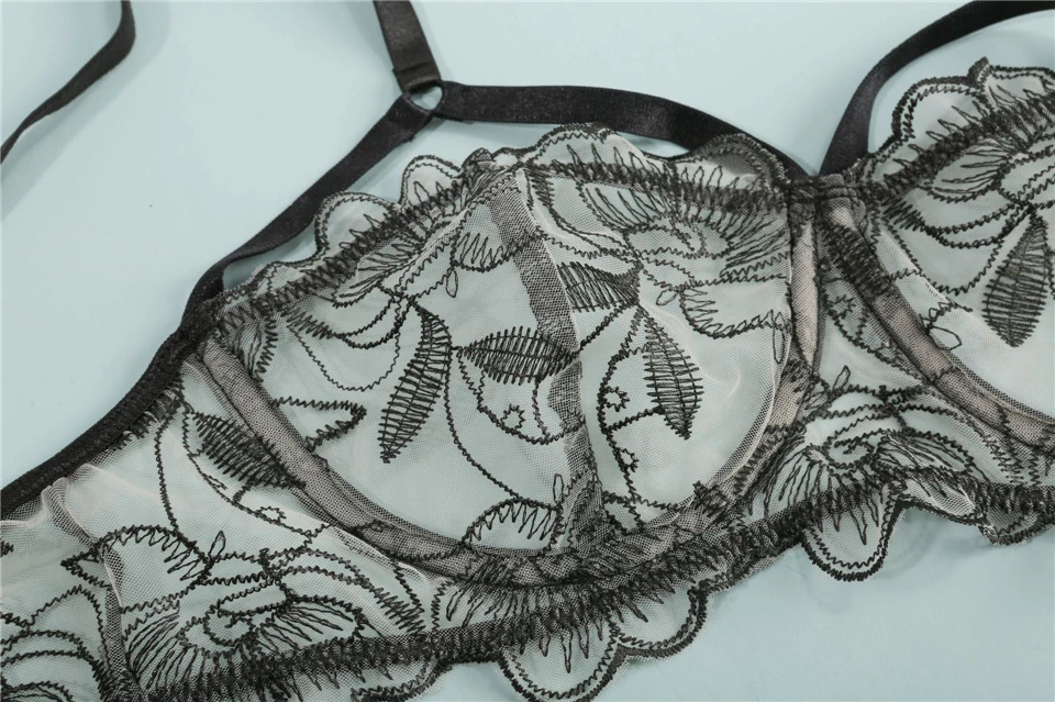 Embrodiery/сексуальное эротическое нижнее белье, комплекты бюстгальтеров, прозрачное кружевное женское нижнее белье, бюстгальтер пуш-ап + подвязки + стринги, комплект из 3 предметов