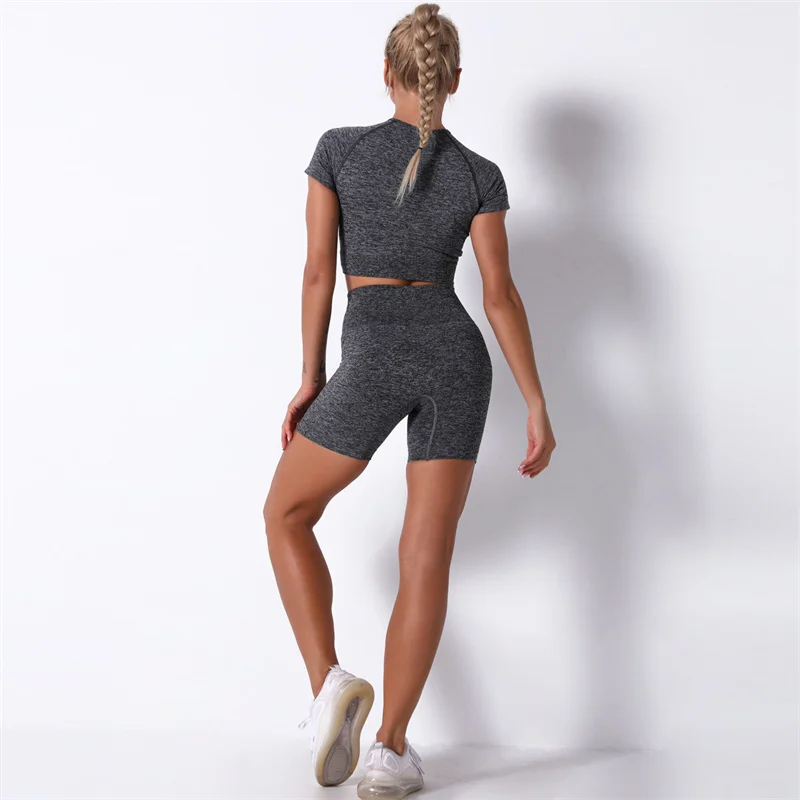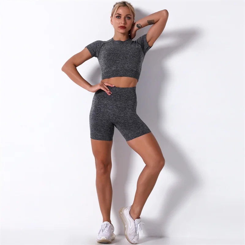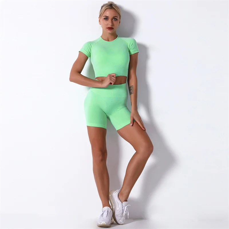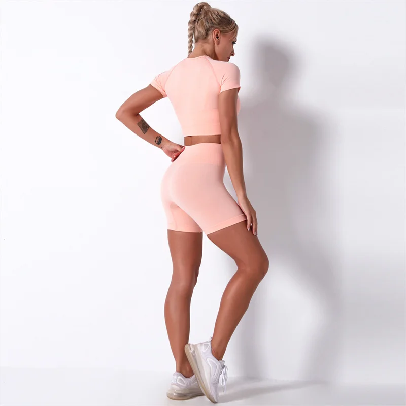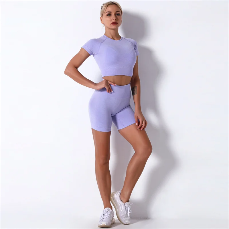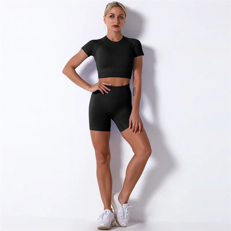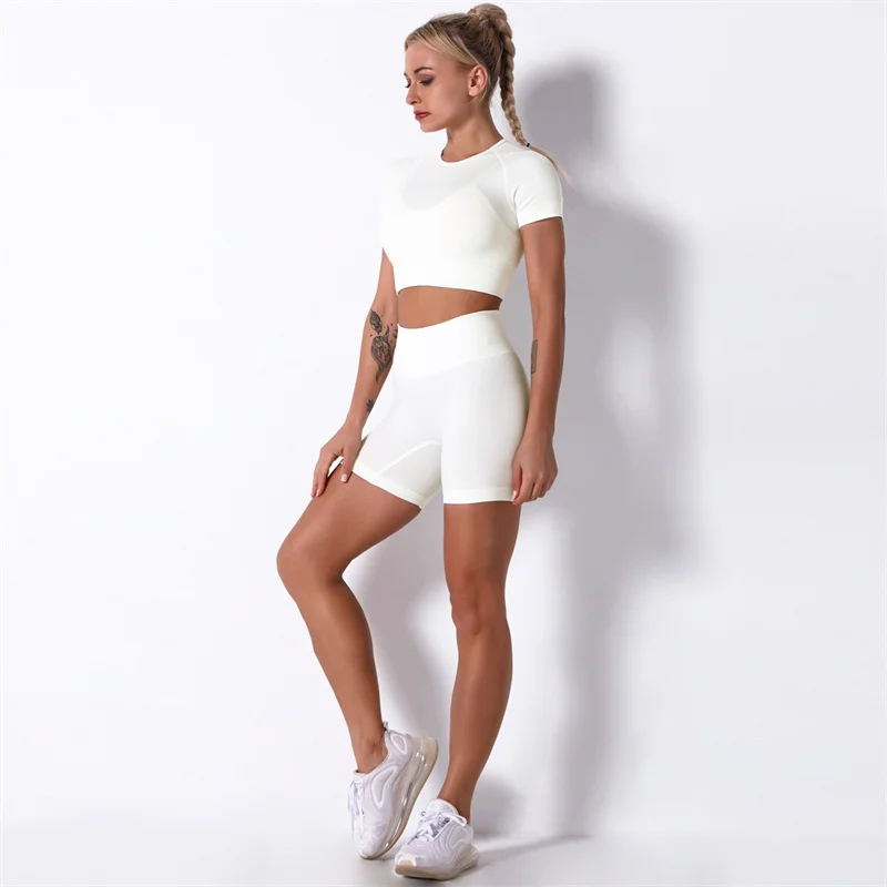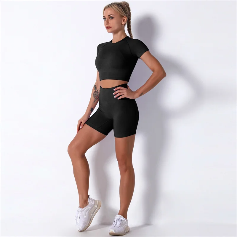 Бесшовные шорты, спортивная одежда, женский сексуальный костюм для йоги, одежда для фитнеса, короткий топ с круглым вырезом и коротким рукавом, однотонные брюки с высокой талией, 2 шт.