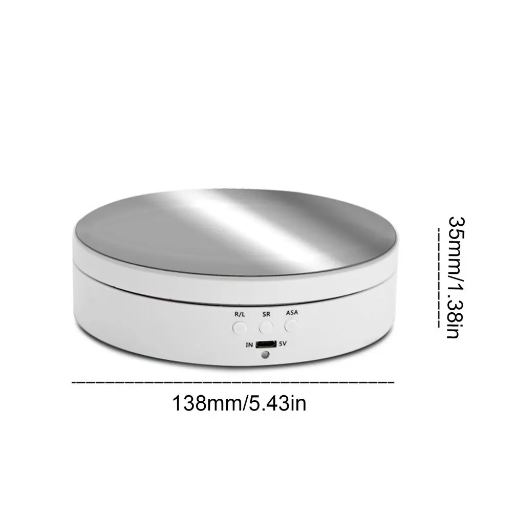 Три скорости: 2/4/6 об/мин (оборотов в минуту)Вес подшипника: 4 кг, 3 кг, 2 кг.Углы поворота: 45/90/180/360 градусов.Направления поворота: по часовой стрелке/против часовой стрелкиИсточник питания: батарейки AAA/usb-вход/перезаряжаемая батарея 18650. (Не включая батарею)Материал: АБС-пластикДиаметр: прибл. 13,8 см/5.43inВысота: прибл. 3,5 см/1.38inЦвет зеркала: черный, белыйКоличество: 1 Набор