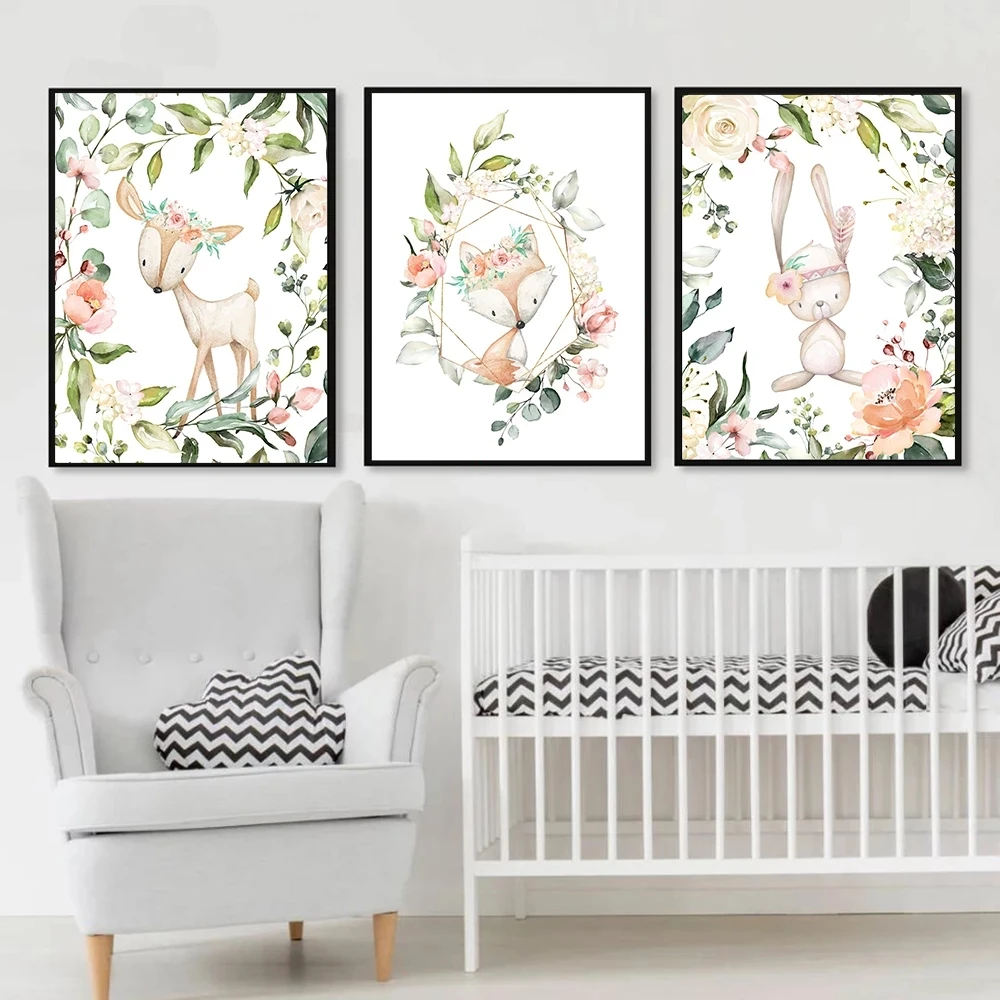 Плакат WTQ с изображением кролика, оленя, лисы, на холсте, с изображением животных, с оливковой веткой, в стиле бохо, Цветочная зеленая Настенная картина, декор для детской комнаты