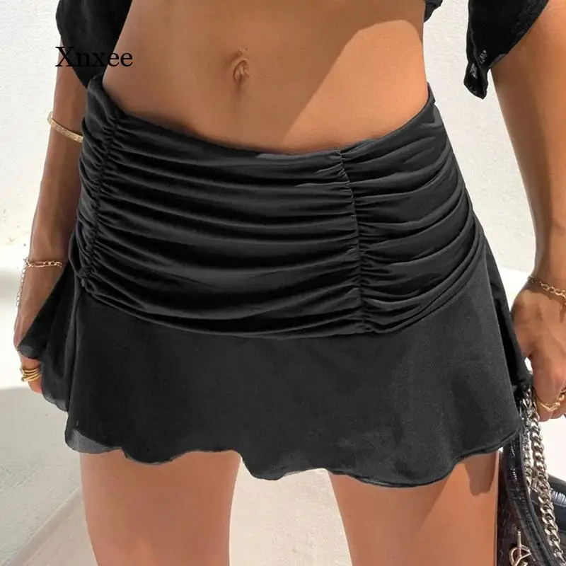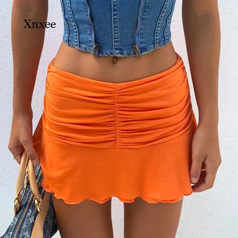 Женская плиссированная мини-юбка с рюшами, оранжевая или черная однотонная Короткая юбка для плавания с высокой талией, Y2K, 90S, лето 2021